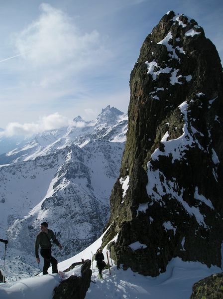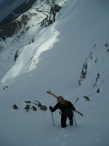Excellent petit circuit de la matinée dans une bonne neige transfo-moquette puis bien accrocheuse avc qques restes de vieille poudre en NO. C'est Loïc de Bivouak, rencontré en haut du premier couloir qui nous a soufflé l'itinéraire contre le prêt de la carte.. Du coup on a enquillé ensemble.