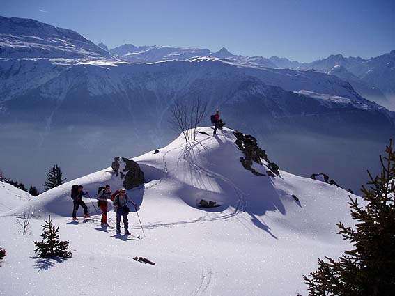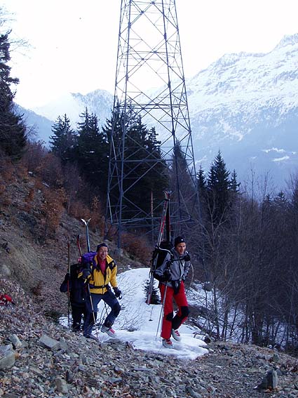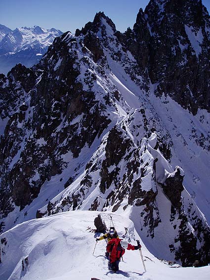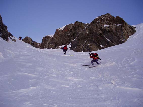 Superbe journée. Le couloir NE des arêtes d'Allemont qui aboutit bien à droite de la Grande Lance à une altitude similaire à celle du Grand Charnier est court mais très beau et bien raide. Il nous tendait les bras et on l'a intégré dans le circuit. Décidemment, on n'en apas fini de découvrir ce fantastique massif. A noter toutefois une neige un peu moins abondante et plus soufflée qu'en Belledonne nord. 10' de portage au retour sur la route pour finir.
