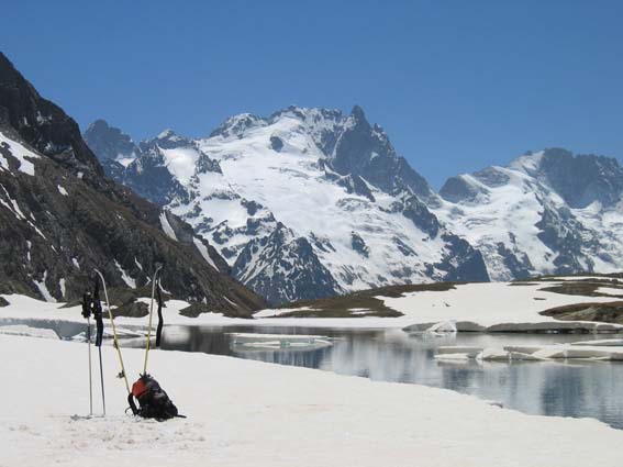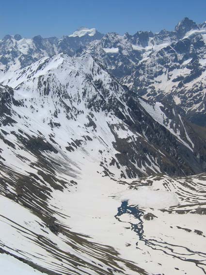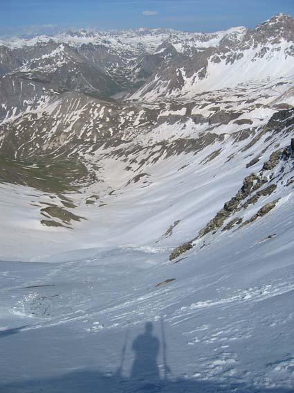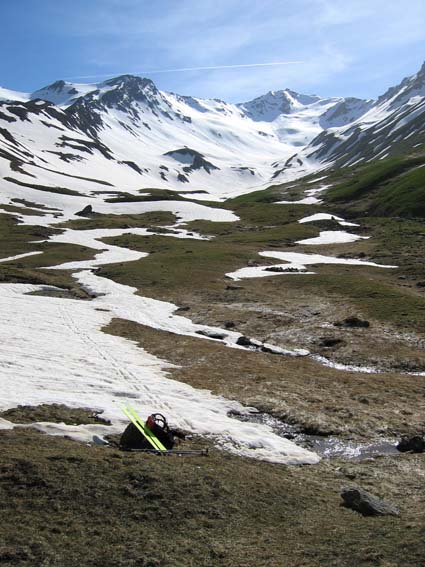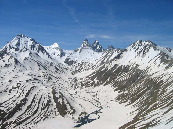 On se laisse d'abord glisser le long des gypsières, puis on traverse une argentière tout en faisant le tour des lauzettes. Non sans avoir posé le pied sur 3 évéchés, une appellation bien plus pertinente que le découpage administratif moderne, fâché semble-t-il avec l'orographie. Au total, du ski intégral en descente sur 2150 m et sur des neiges parfaites. Le névé est en revanche un peu plus ripant à la montée en peaux.Cette ouverture précoce du galibier sauve un peu la mise en cette fin de saison sèche. 3 evechés classique est (depuis 2350) et pic blanc (juste au-dessus) devraient tenir encore quelque temps. A noter aussi que le goleon depuis valfroide ne paraît pas un plan si débile : il m'a en effet semblé (mais c'est un peu masqué) qu'on doit pouvoir descendre dans la gorge jusqu'à 2300.