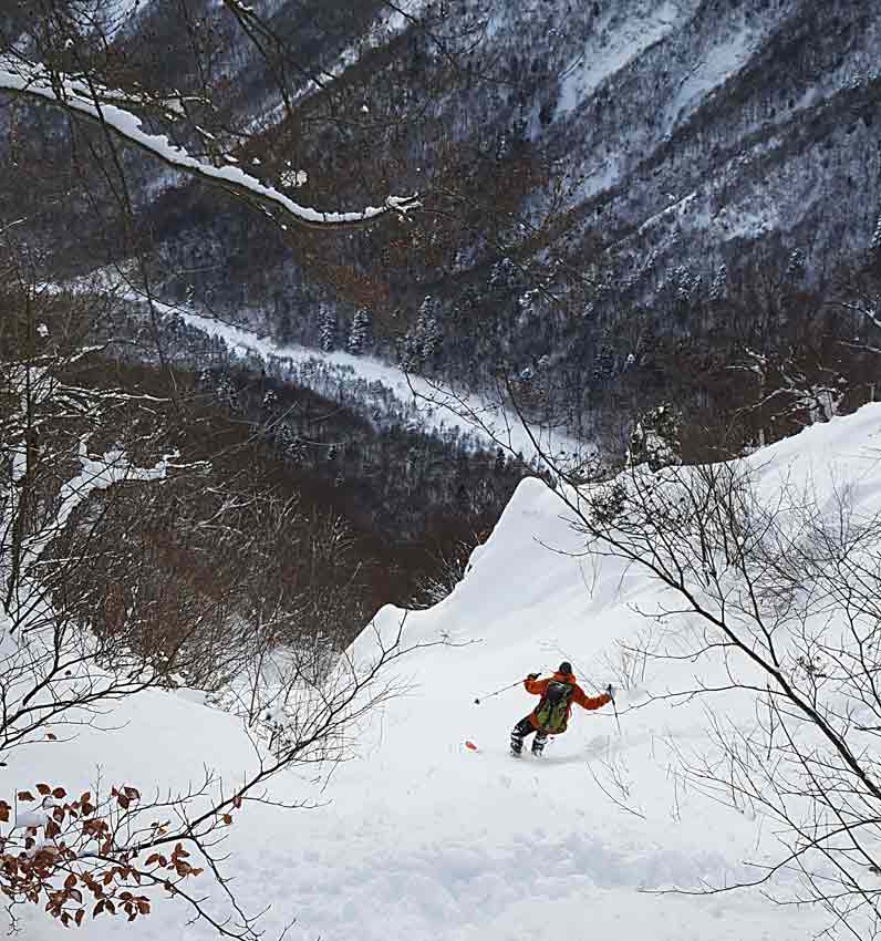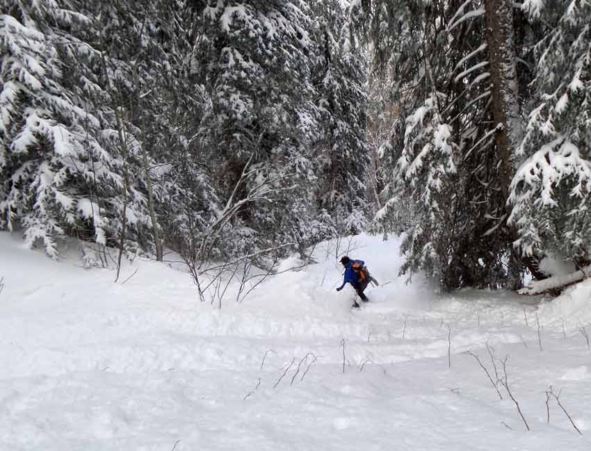Avec le froid de la nuit (et du jour aussi) la neige semble s'être un peu "allégée" : traces directes à 15-20° avec enfoncement de 40 cm, plus glissantes que la veille.