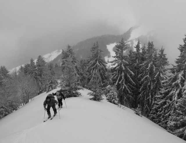 J'avais en mémoire un dôme d'Arguille que nous n'avions pu atteindre l'an dernier même en montant dans la forêt où tout se fissurait. Je craignais qu'on nous resserve le même coktail ce jour, et puis non. D'abord la couche de fraîche n'est pas si importante, et malgré une bonne cohésion et un fond parfois gelé, nous n'avons rien vu bouger.