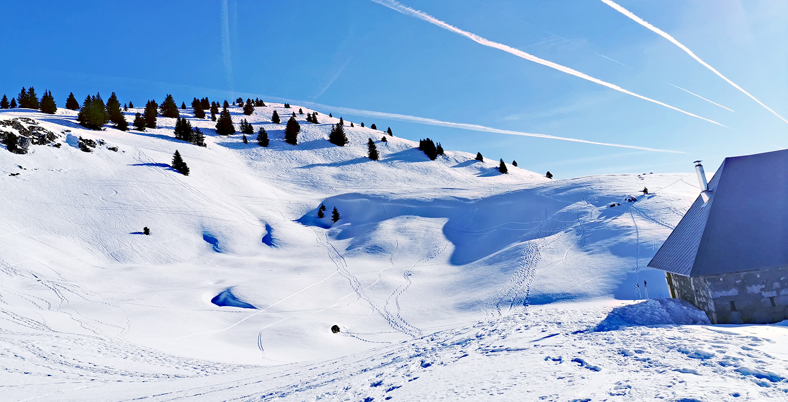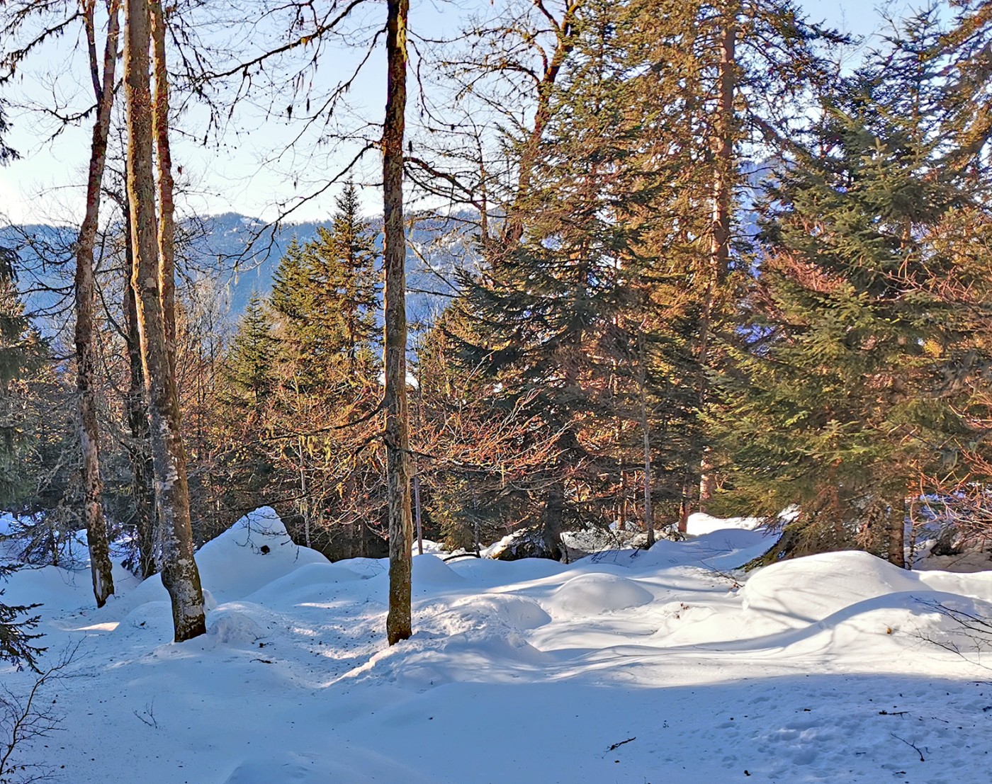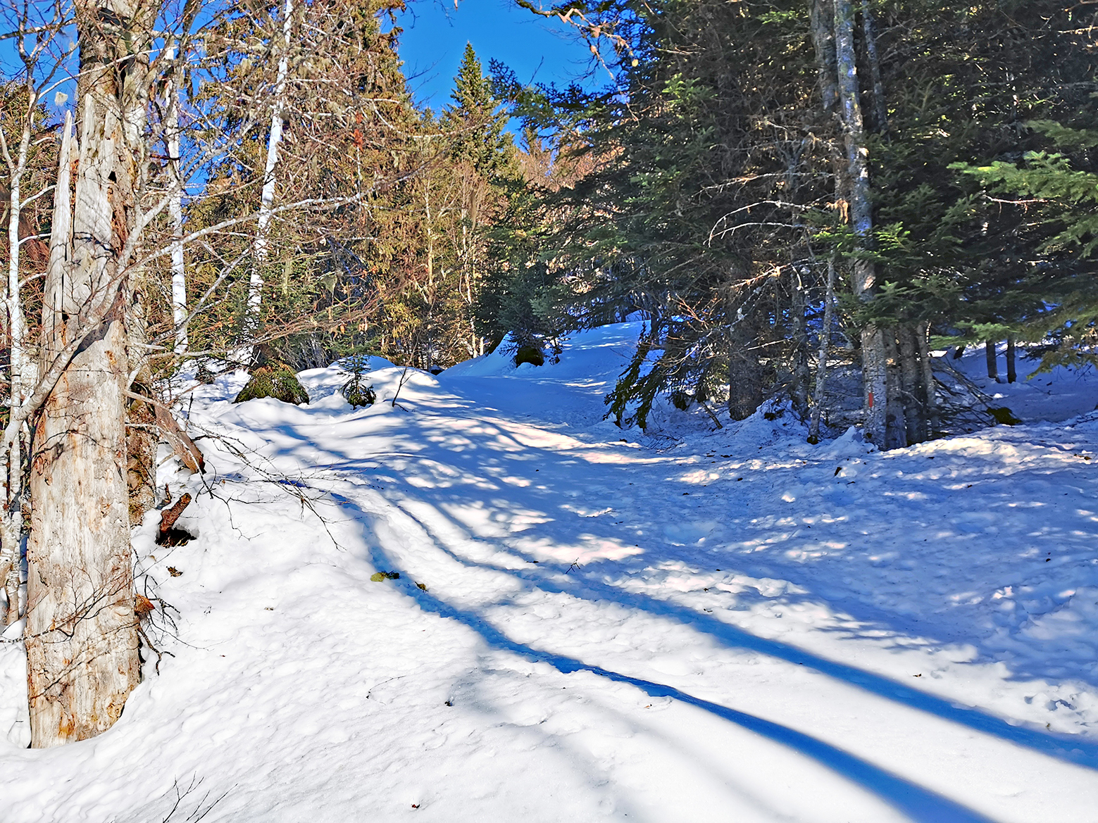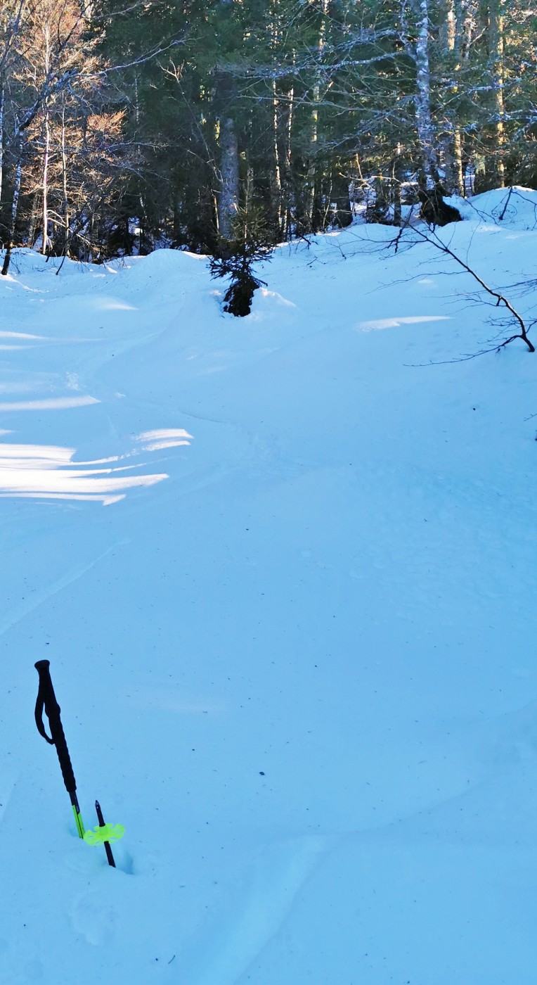 L'équation est simple. Pour skier en forêt il faut des trouées qui évitent de passer sous les arbres qui ont déchargé et sous lesquels on trouve une croûte molle ou gelée. Heureusement ce versant ouest fourmille de drayes dégagées et pas trop inclinées, conservant une poudre légère avec faible enfoncement.