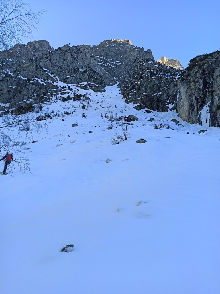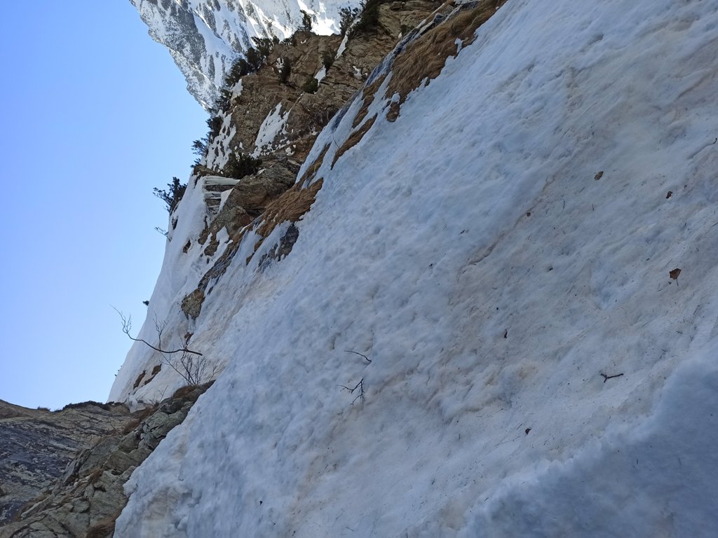 J'avais dans un coin de ma tête ce vallon depuis longtemps. La grande inconnue est le passage de la vire à bicyclette. Nous somme montés avec les skis jusqu'à sous la vire, nous nous sommes aperçus que le manteau n'avait pas encore transformé en profondeur (à ski ça porte mais pas à pieds). Crampons sous la vire. La neige est plaqué sur les rochers et ne tient pas trop et on traverse la totalité de l'épaisseur, au bout de 40m on arrive dans un passage plus étroit et vraiment expo, j'enfonce jusqu'à la cuisse.... on discute avec Joss... la montée n'est pas problématique mais nous sommes sceptique pour la descente, si ça ramollie vraiment sur toute l'épaisseur ça risque d'être très délicat. Nous sommes d'accord pour faire demi tour, le vallon attendra. Nous décidons de partir dans le vallon de font Turbat. Devant nous la trace est faite par Thierry et ces compagnons. (voir C2C). Nous pensons un moment au col Turbat mais la neige ne nous inspire pas, très irrégulière et piégeuse, tantôt soufflée, tantôt poudreuse et nous avons malgré tout laissé pas mal de temps et d'énergie (et un peu de moral) sur la tentative. Nous filons sous la face nord de l'Olan toujours aussi austère et magnifique. Arrêt à la cascade. La descente est pas exceptionnelle en terme de qualité de neige, beaucoup de croute mais l'essentiel n'est pas là. Une bonne bière à la voiture avec un oeil sur les Arias pour parler de futurs projets en clôture de cette journée.