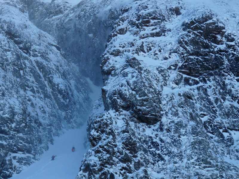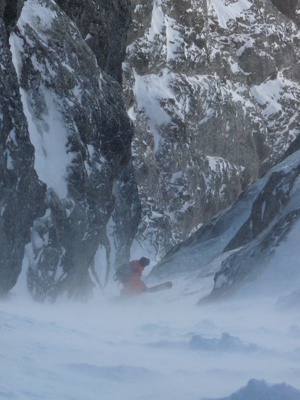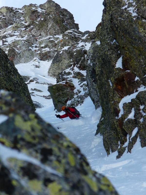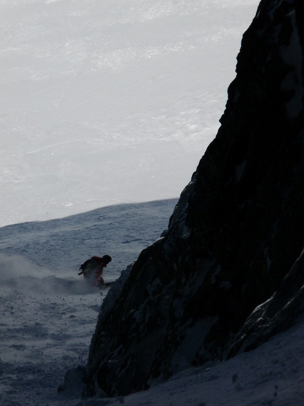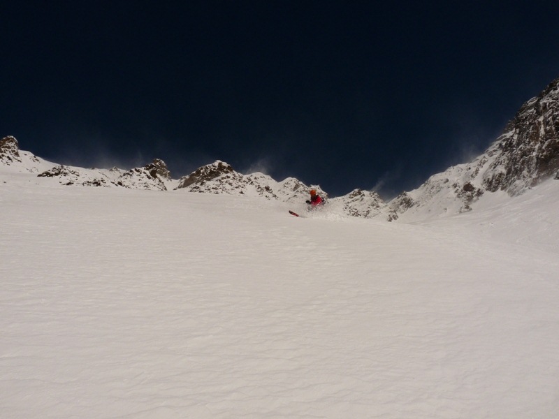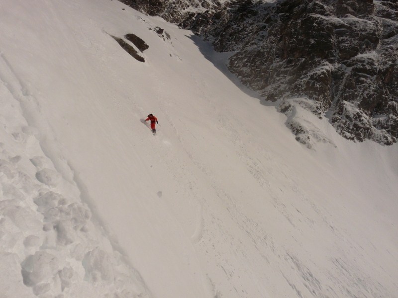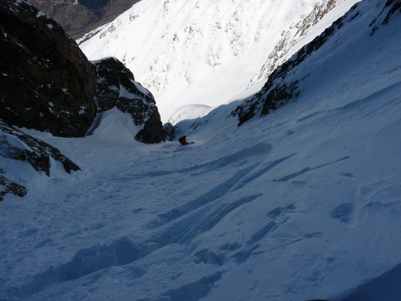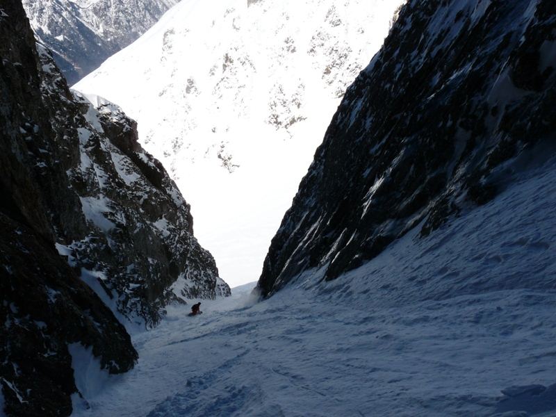 Hormis la sortie plaquée, le couloir était globalement en bonnes conditions mais moins bonnes que celles rencontrées par MLF et NIW. Les étroitures étaient plus marquées. Déchaussage obligatoire en skis, en surf c'est passé sans déchausser en dérapant et en bricolant pas mal avec les piolets...pas pour revendiquer le ski intégral du couloir mais simplement pour s'éviter une manip fastidieuse et se retrouver en boots (à poil quoi) sur de la glace.