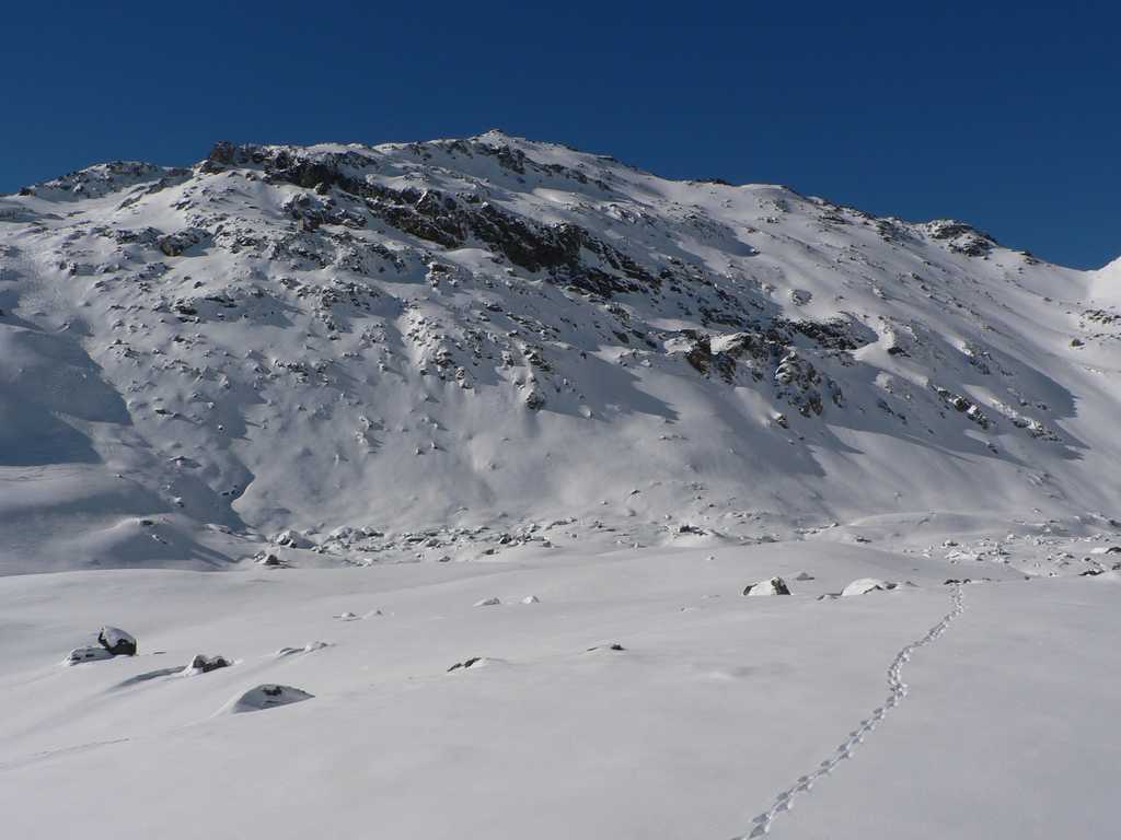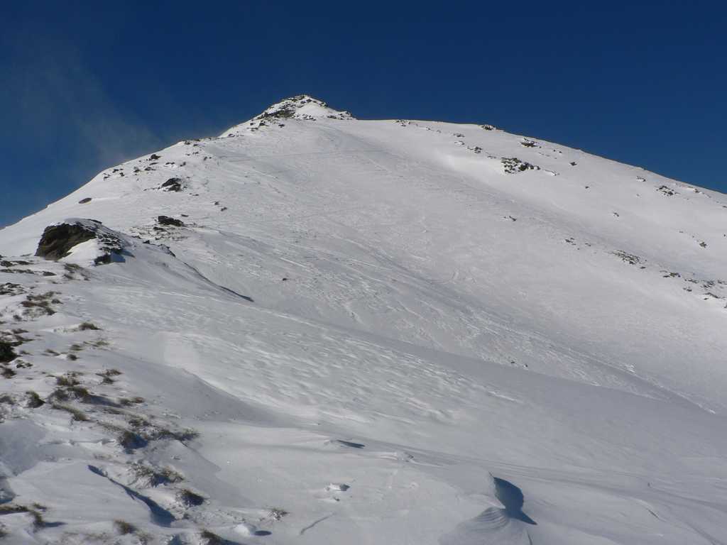 De la route rive gauche du barrage de Beauregard, route forestière jusqu'à Meillares puis crête au sud du sommet et sommet par le versant est. Descente versant est sous la Forcla di Bré.