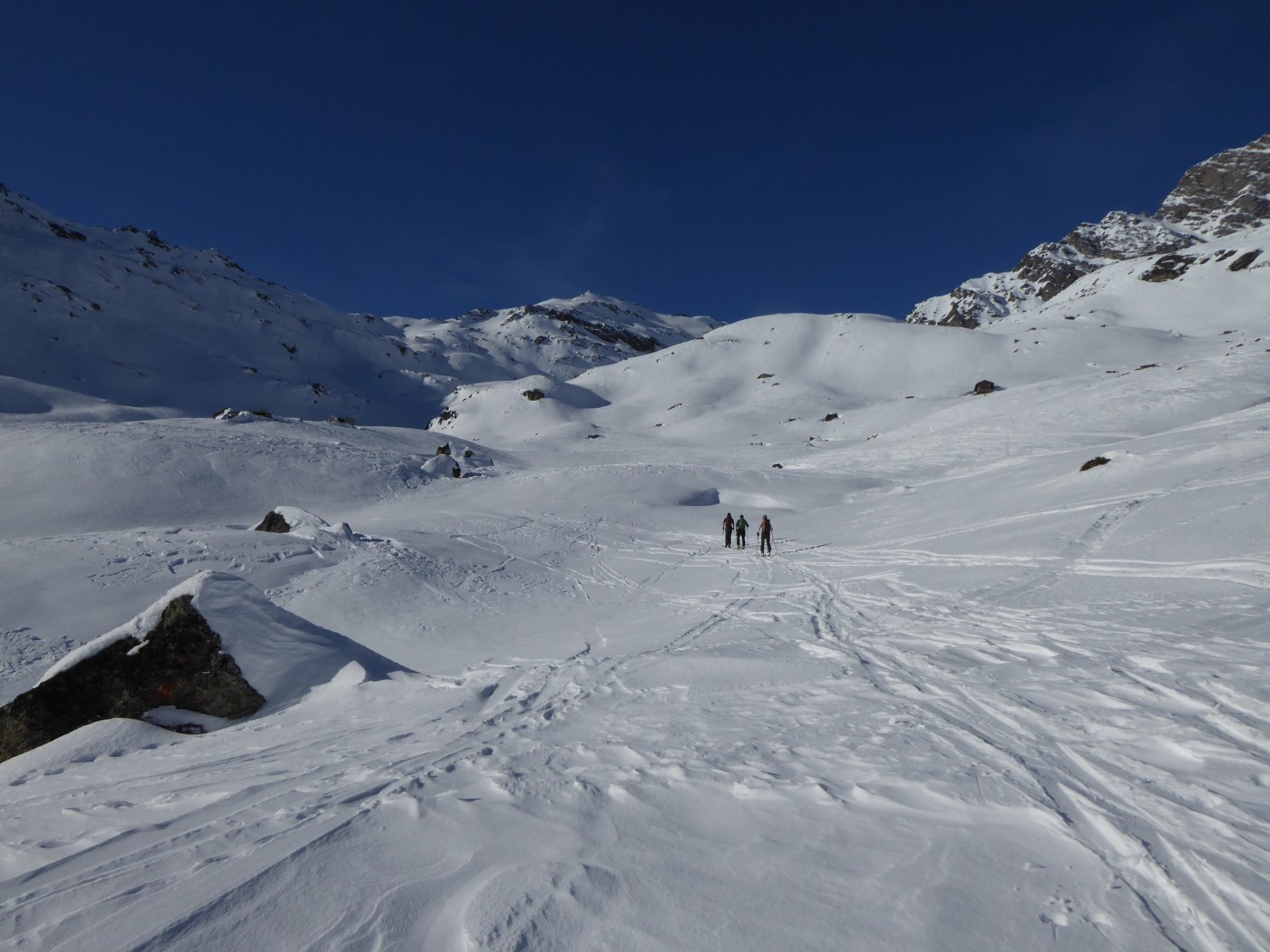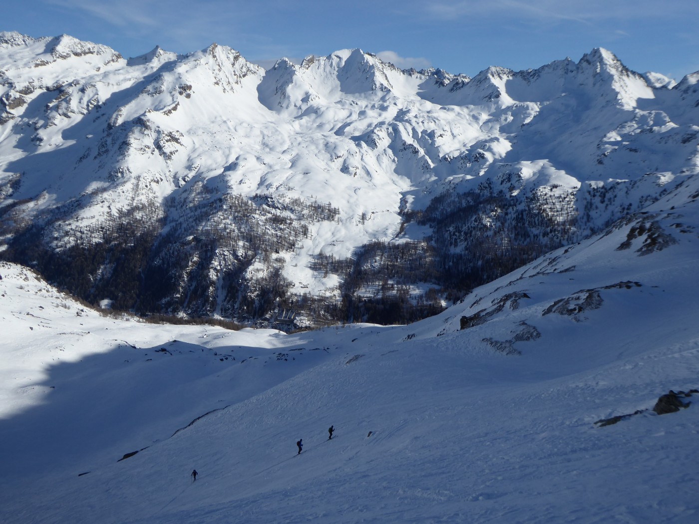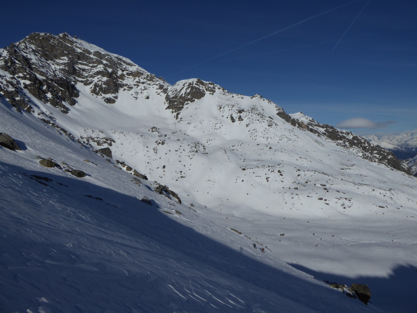 Compte tenu de notre heure tardive de départ, nous étions seuls au sommet. Quelques rotations d'hélico sur la rive droite du Valgrisenche à peine génantes pour nous qui étions sur l'autre rive.