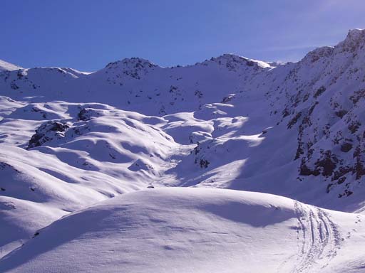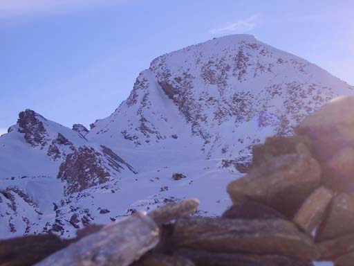 Je craignais un peu les effets de la chasse-neige de la veille, mais à part les derniers cinquante mètres un peu plaqués entre 3200 net 3250, le reste demeure stable, et les transports ont été très faibles. À signaler tout de même une plaque de surface (environ 10 cm d?épaisseur, sur 10 m de large et 150 m de long) qui s?est décrochée sans doute il y a deux ou trois jours en versant nord-ouest vers 2900 m sous Rocca Rossa et des traces d?anciennes coulées sous l?Asti (versant nord-ouest), dont l?une est enfouie sous la poudreuse dans le couloir de montée emprunté.