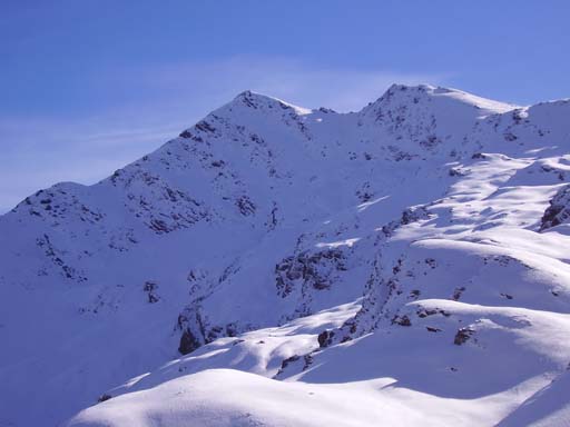 Il faut signaler tout de suite que l?Asti est un sommet double, et qu?il s?agit là du sommet ouest, bien identifié sur ASF 8, quand IGN le situe à tort à l?est. Dans la combe de montée, plusieurs traces de la veille restaient dans l?axe pour déboucher sur la crête entre la pointe 3172 et l?antécime de l?Asti à 3258, sans doute plus précisément entre les cotes 3192 et 3180. ASF 8 situe ici une pointe Brusalana, sans que l?on sache si elle désigne la pointe 3172, bien individualisée, ou un autre point plus élevé à l?est de l?arête. Cotation proposée 3.2/E2/PD-