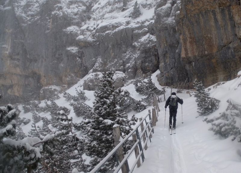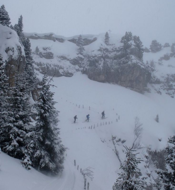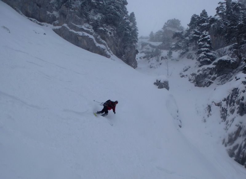 Que ça fait mal de comparer les conditions actuelles avec celles de l'hiver précédent ! Les piquets de clôture du cirque, entièrement visibles sur presque toute leur hauteur, sont autant de témoin de notre infortune (temporaire j'espère). Ski malgré tout correct dans le couloir, plus bas il faut rester vigilant pour minimiser les touchettes. Autres impressions et photos [ici->http://lesbertonches.over-blog.com/2014/01/une-petite-virgule-de-fin-d-aprem.html]