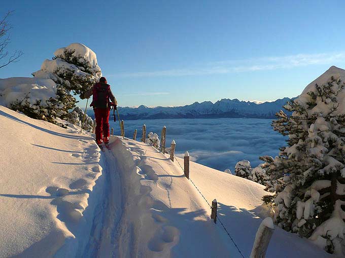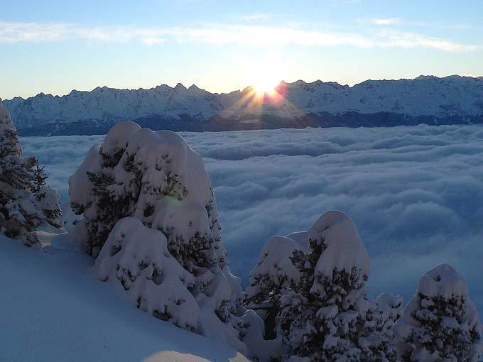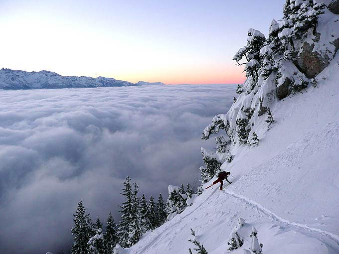 Contraste maximal d'émotions : contemplatif 5 étoiles avec lever de soleil en haut du magnifique cirque de l'Aup du Seuil d'un côté, et de l'autre, du bien mauvais ski en raison de la neige très densifiée par le vent. Plus de photos [ici -> http://lionel.tassan.free.fr/images%202008/01/13%20aup/index.htm]