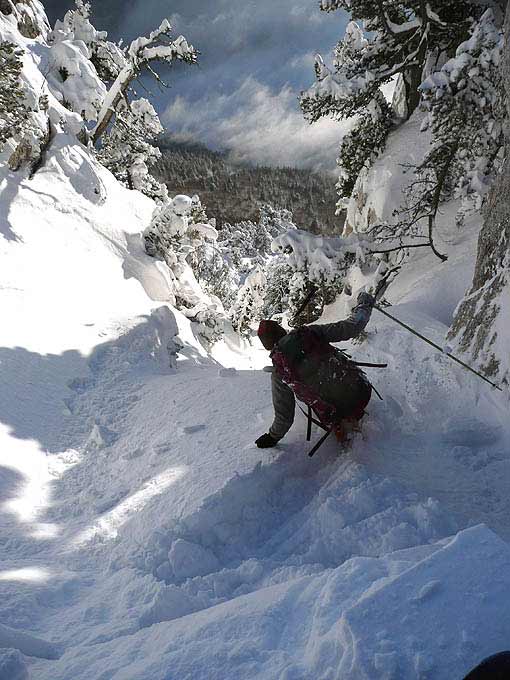 Comme A4 mais on suit un peu la crête vers le nord pour skier le Rectiligne (comme son nom l'indique est à peu près tout droit contrairement à la Virgule voisine). Le couloir est moins skiant que son voisin et présente deux étroitures (1m50, en haut et en bas) que nous avons sauvagement abîmées par de beaux escaliers.