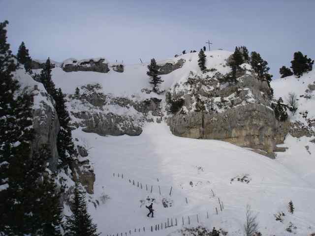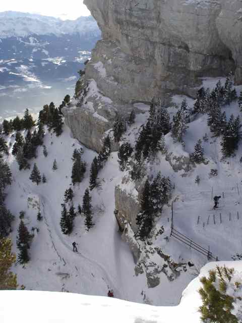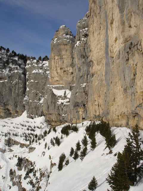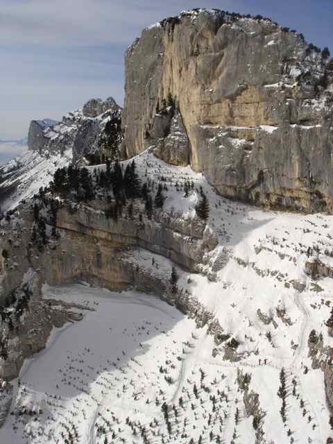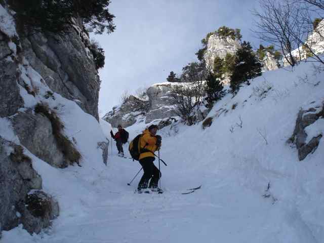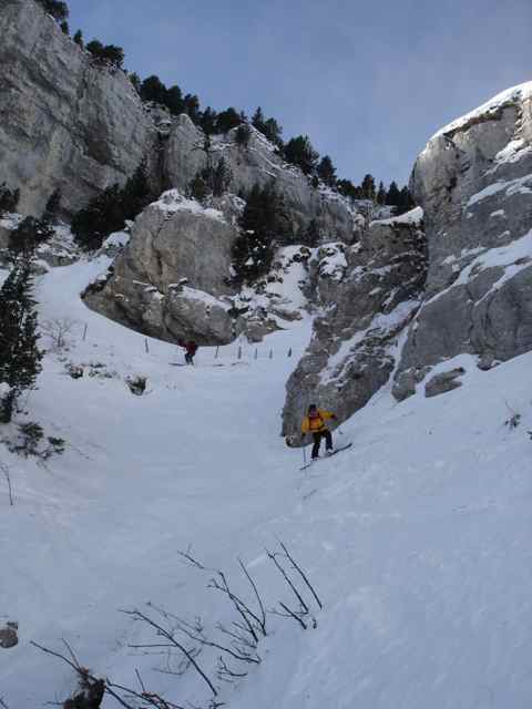 Pour Thierry et moi, première sortie de la saison... et première à l'Aup-du-Seuil. Valeur sûre que cette virgule et cette course au cheminement singulier. Des bosses apparaissent au sommet du couloir. La partie en forêt sous le couloir, est déjà un peu pénible par neige lourde.
