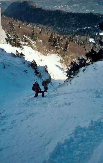 A la descente vers 1600, nous avons quitté l'axe du couloir vers la droite pour rejoindre le chemin de montée mieux enneige que la forêt