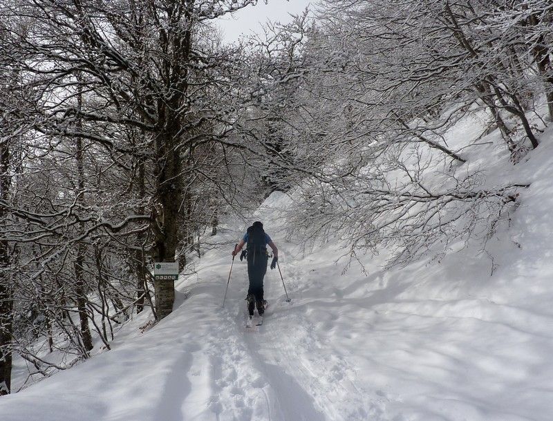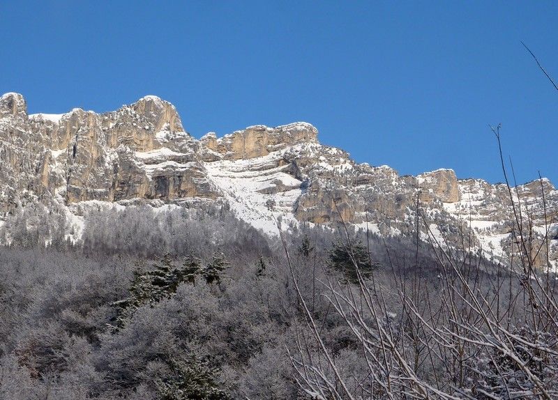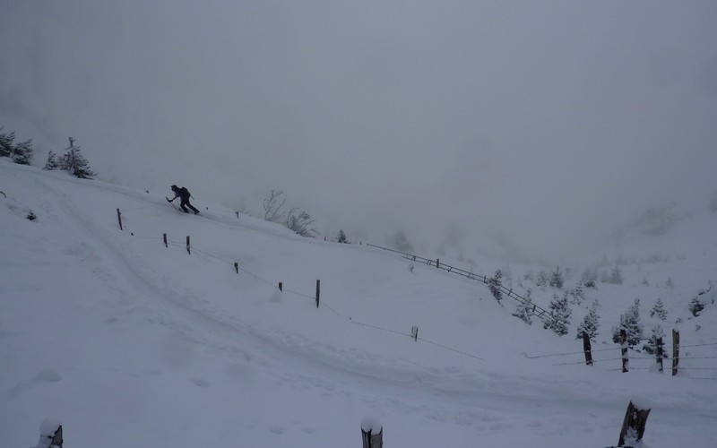Joli paysage dans l'éclaircie matinale (pour en profiter complément il aurait fallu partir 1h plus tôt). Ski pas mauvais dans le haut du couloir très bien rempli et bien lisse, plus moyen en bas à cause du relief sous-jacent. Ski en forêt peu agréable dans ces conditions mais une belle matinée quand même (prévue à l'origine sous le crachin grenoblois).