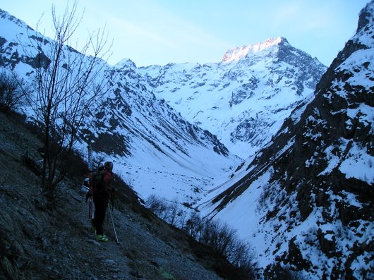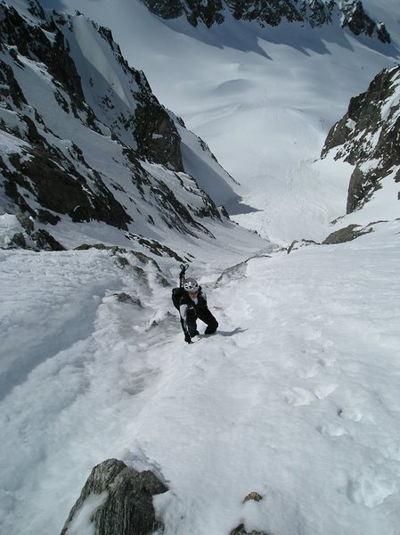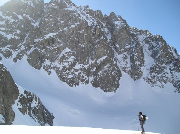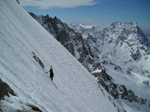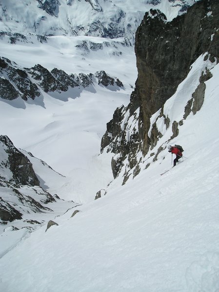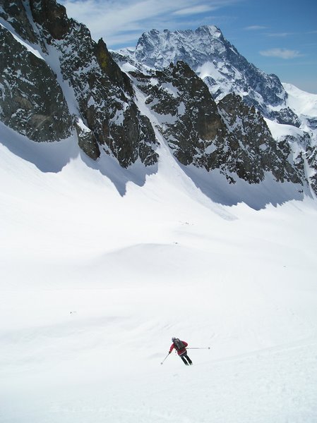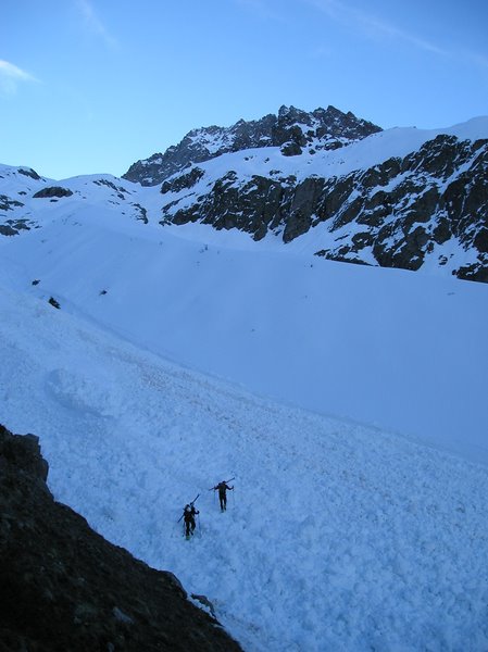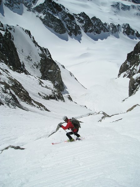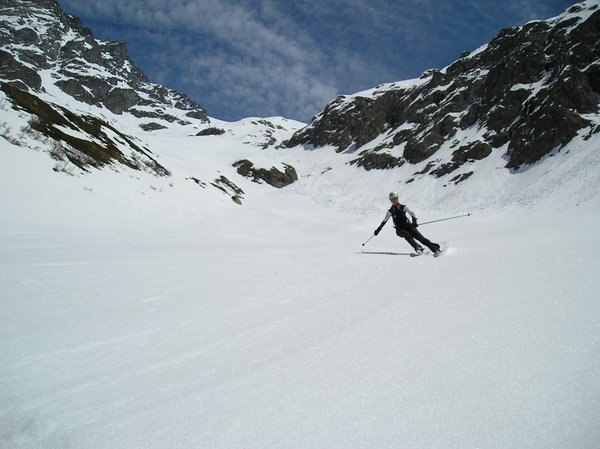 Le couloir des Aupillous, si il était plus rempli que son voisin d'en face, présente une goulotte centrale et beaucoup de rochers vers le milieu. Cela en fait un ensemble très (trop à mon gôut) raide, en obligeant à évoluer sur les contre-pentes et plus exposé que le E2 initial. Résultat je n'ai pas pu faire un virage sur toute la partie supérieure... Du raide en transfo. cela n'a vraiment rien à voir avec du raide en poudre.. Il faut certainement un temps d'adaptation.. J'espère revenir un jour le torcher! Deux autres gars devant nous dont un au style "folklo" en descente bien flippant! (problème de fixation?)