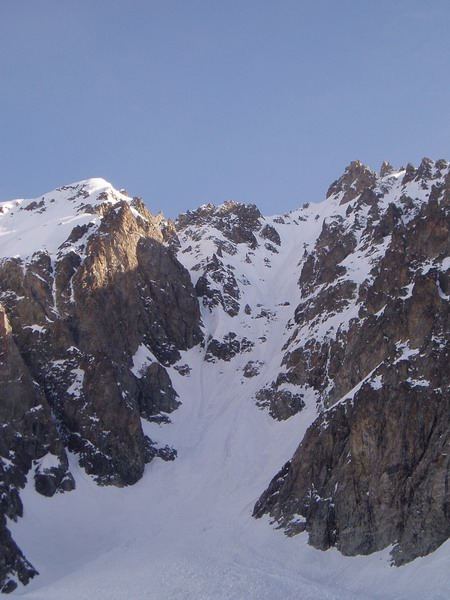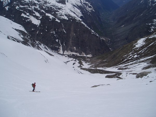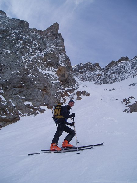 Notre but initiale était le couloir NW du Jocelme. Celui-ci est moyennement rempli en bas avec une petite goulotte au centre et très peu rempli en haut (pas mal de rocher). On est quand même monté jusqu?à la rimaye pour constater en plus qu?il y avait très peu de poudreuse -> redescende et direction le versant sud où nous sommes montés le plus haut possible coté Aupillous. Accès à l?arrête sud par un bref passage raide et arrêt vers 3300 quand l?arrête devient rocheuse. Belle vue de là où on surplombe le couloir Coolidge. Pour descendre quelques virages un peu exposés sur l?arrête