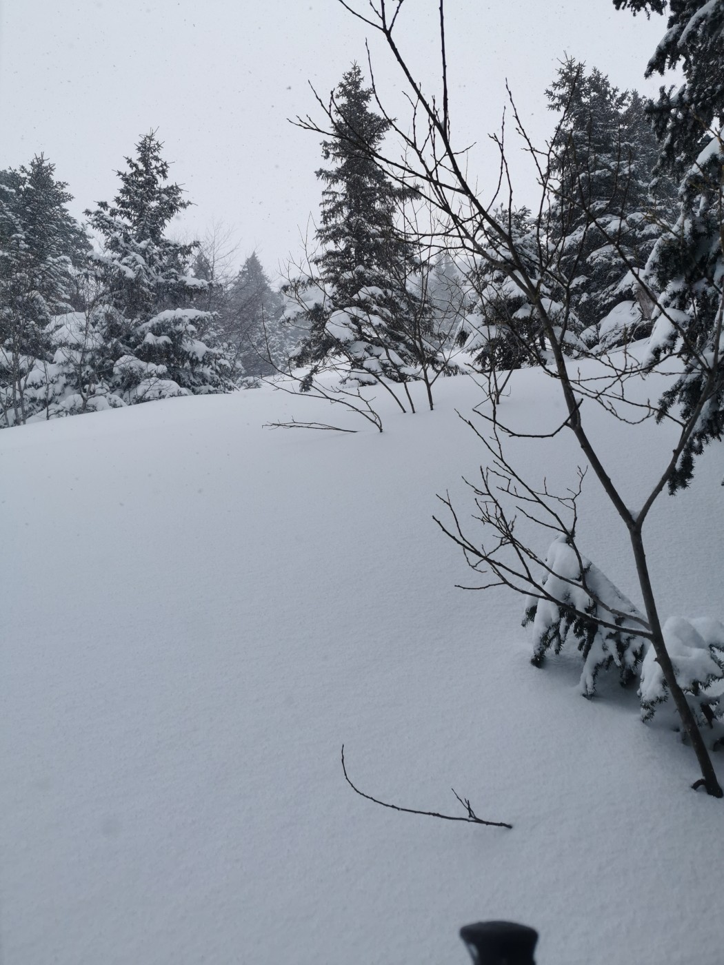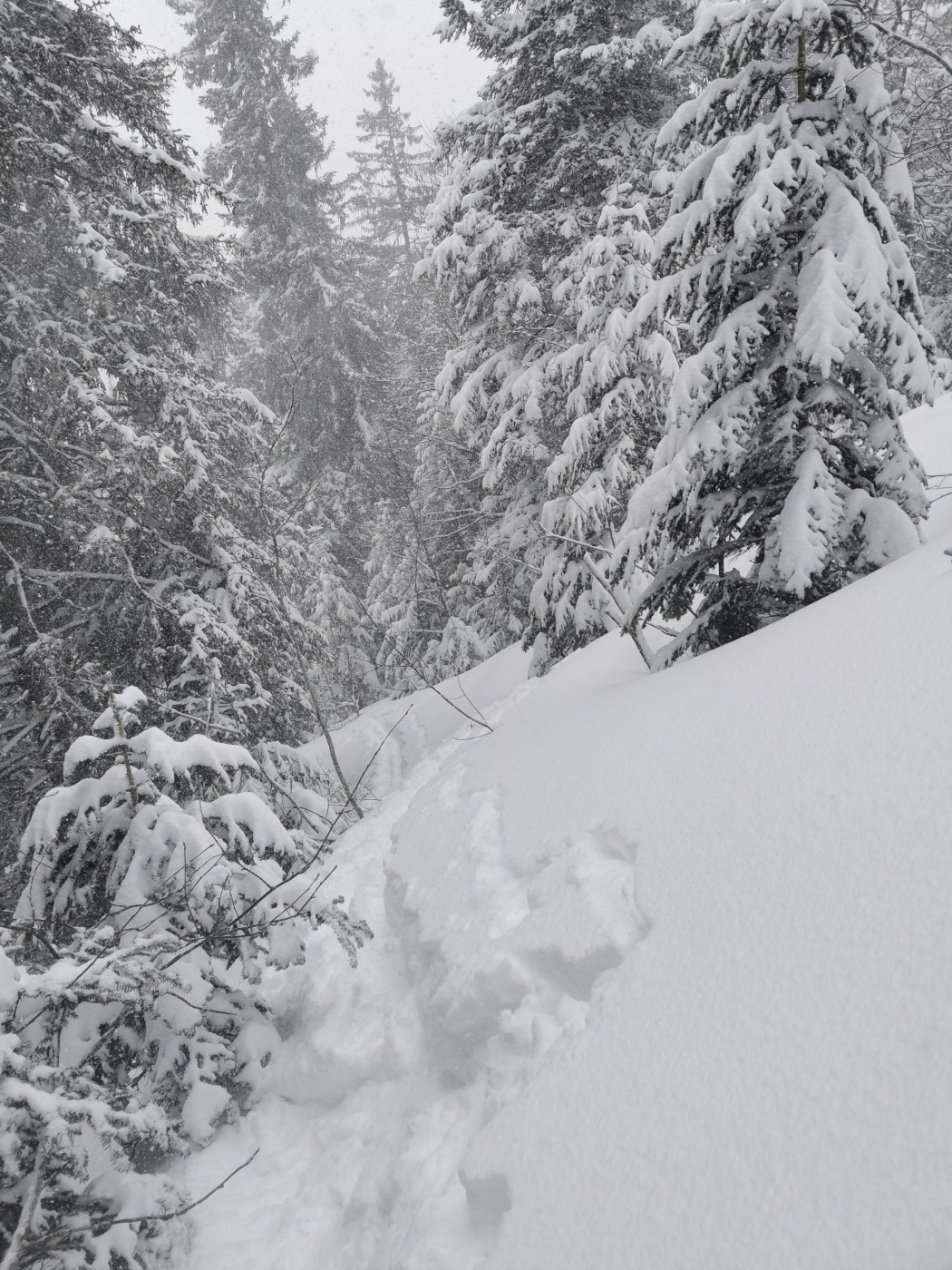 Il a du y avoir une intensité de 10cm/h à certains moments cet après-midi. Neige très légère assurant une bonne glisse même en peu raide mais très inconsistante. Fissures systématiques même en forêt à partir de 1500.