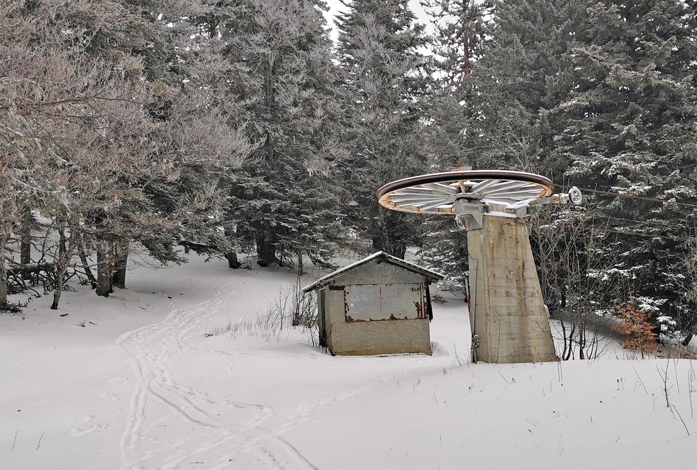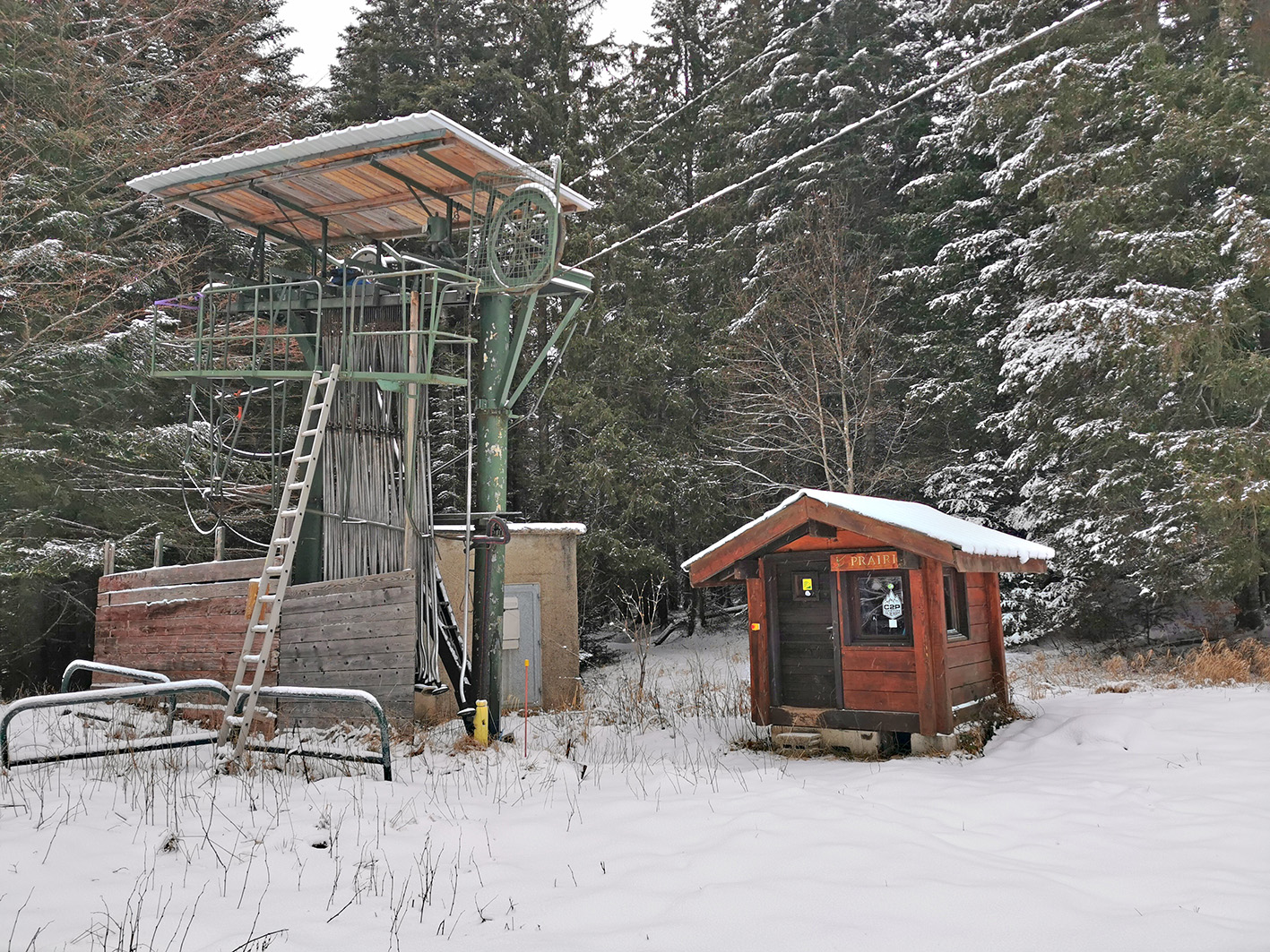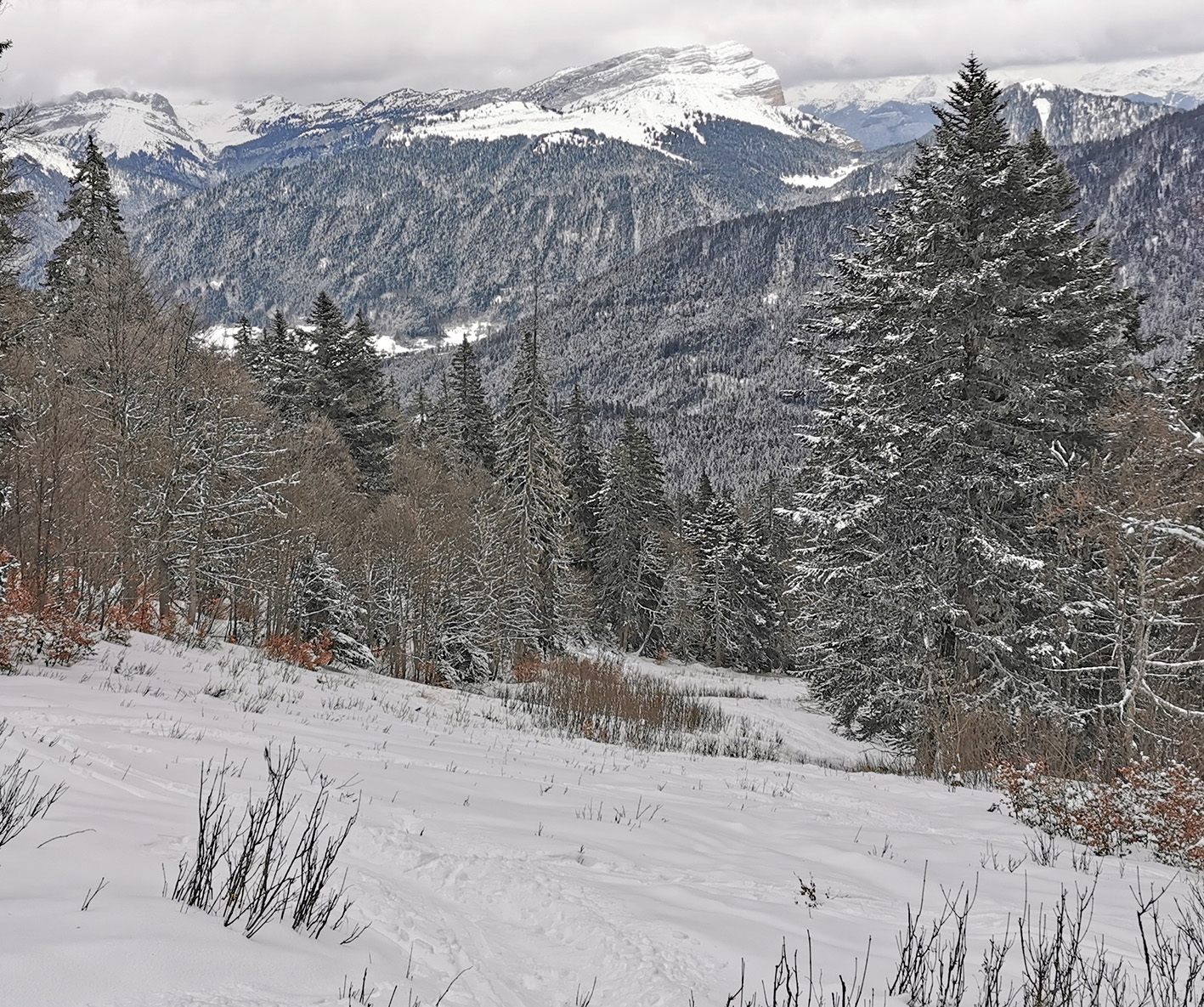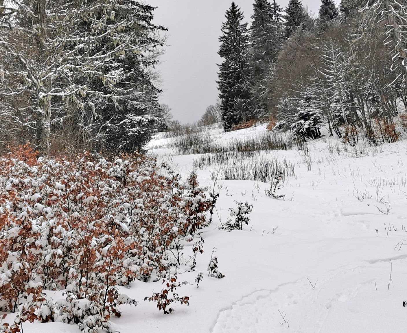 Très peu de neige mais on ne touche nulle part ni sur la route ni sur l'ancienne piste jusqu'à 1500 ni sur celle de la prairie à 1220. En haut le miracle des vernes sans cailloux et en bas celui du gazon, aussi efficace que le canon.