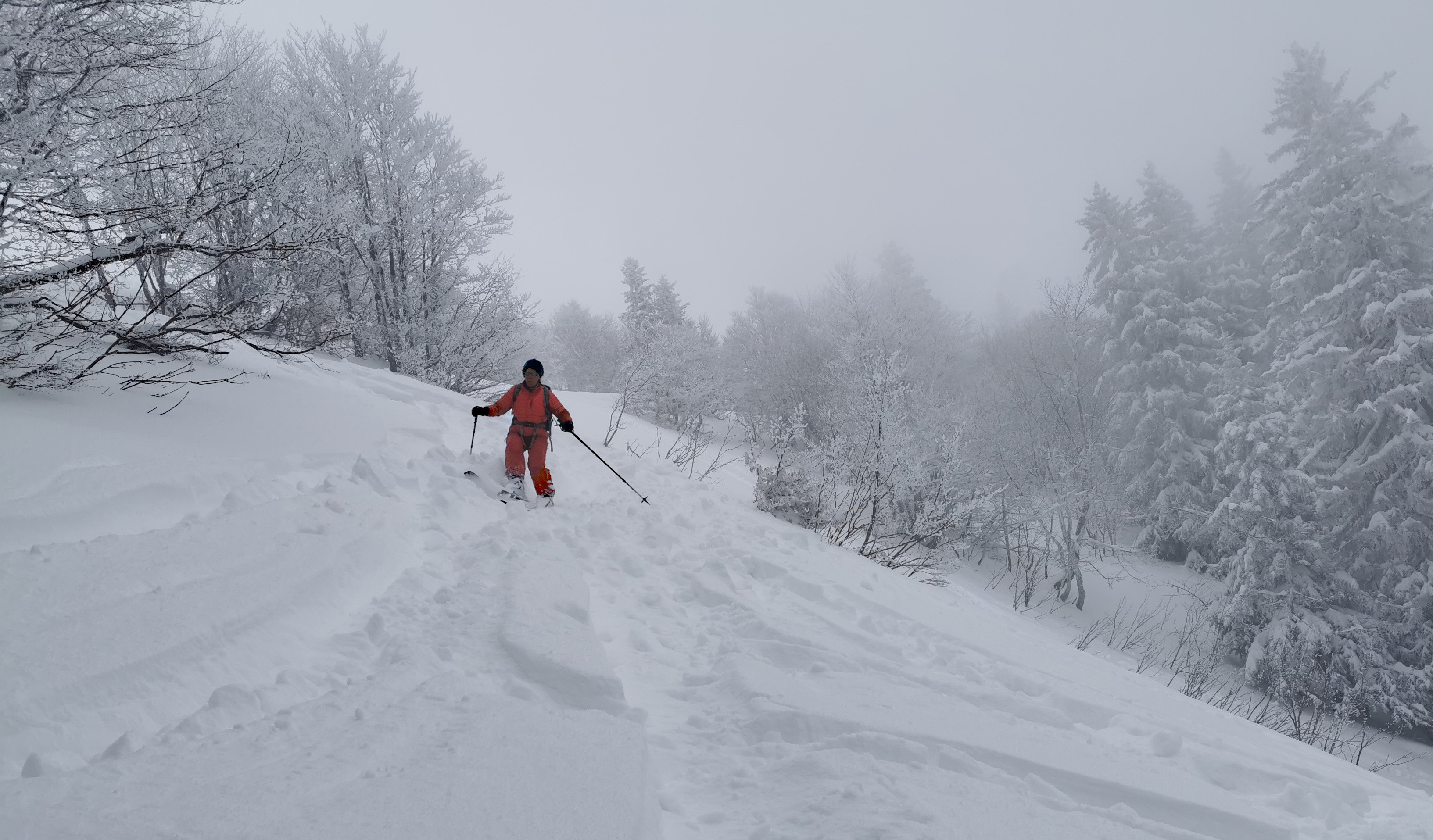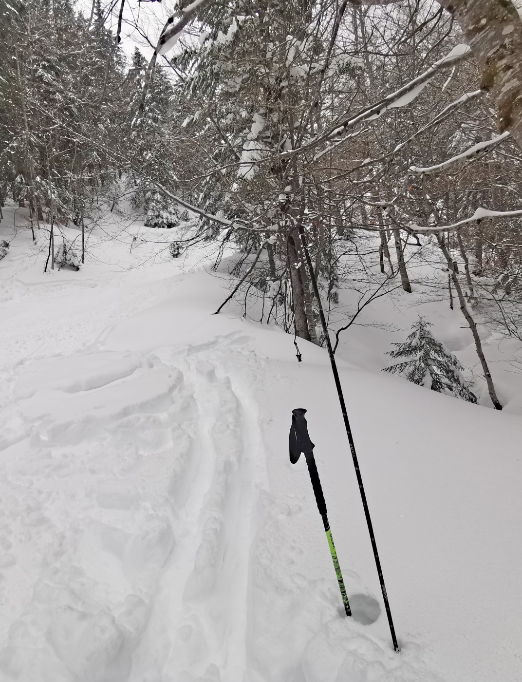 Comme au temps du télésiège, il fallait chercher des zones pas trop damées et surtout suffisamment raides pour glisser sinon le damé-traffolé pas désagréable pour tester un nouveau ski.