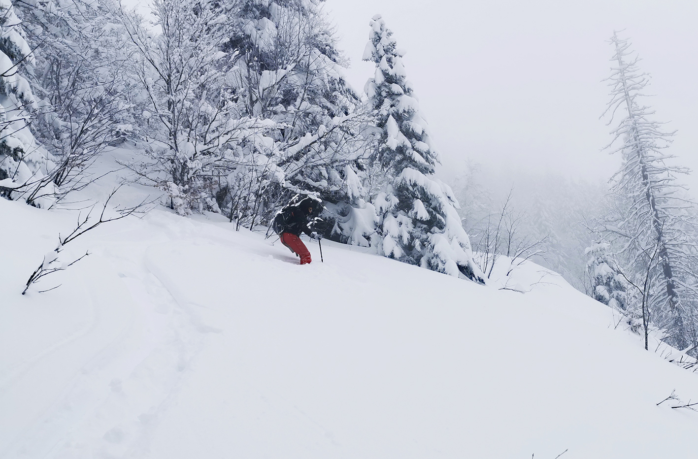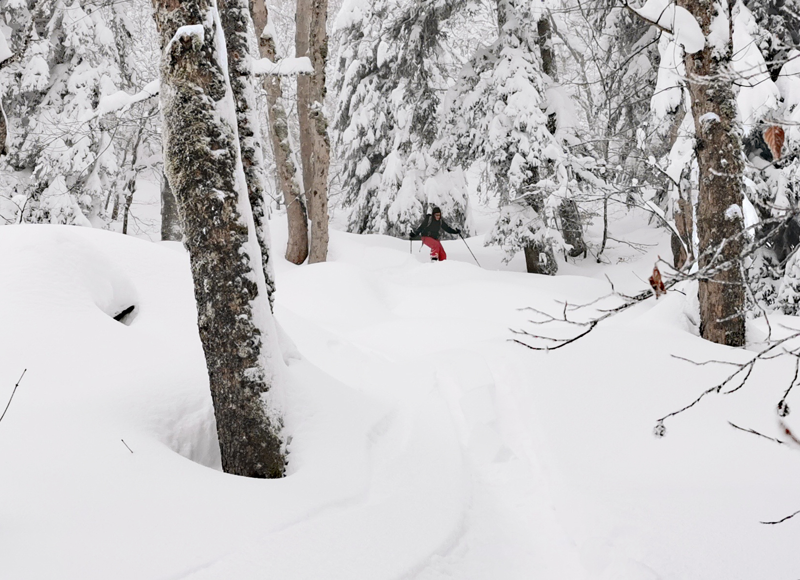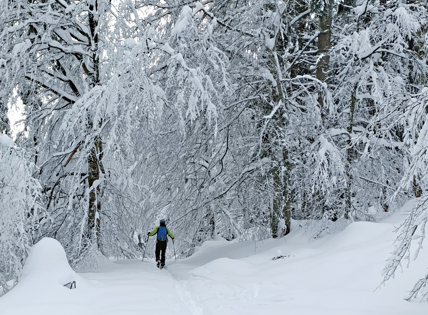 Dans cet ancien domaine mécanisé, les possibilités sont nombreuses en dehors des anciennes pistes. Depuis la dernière chute, le ski en forêt est maintenant possible partout.
