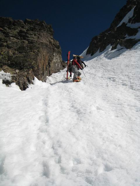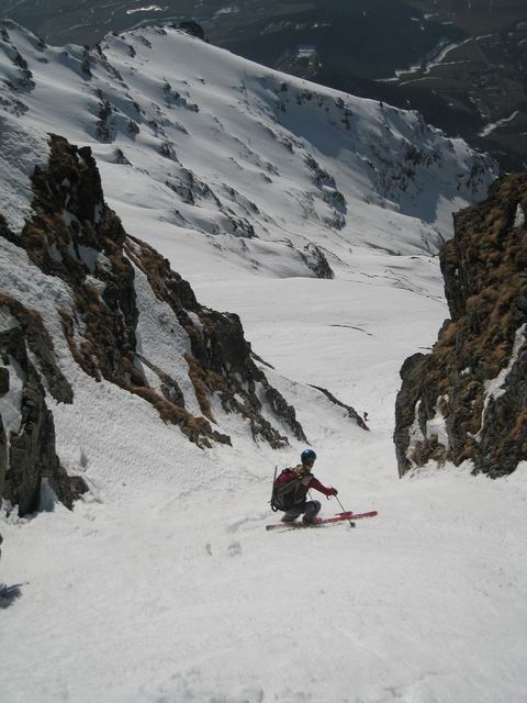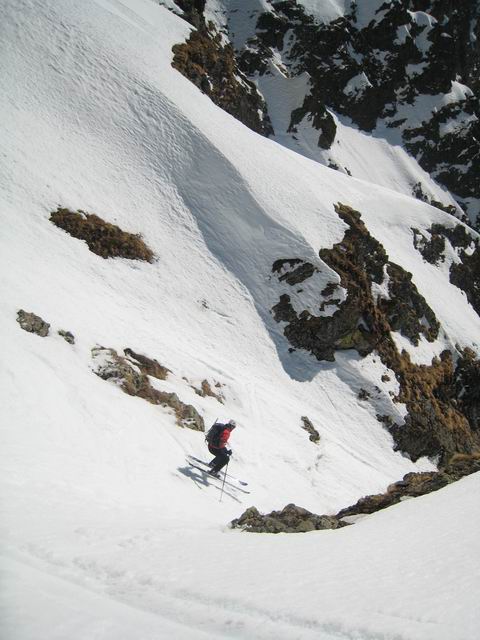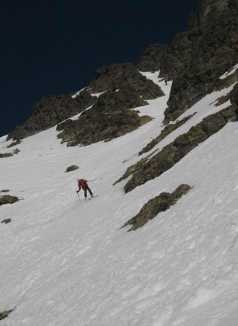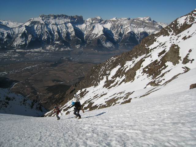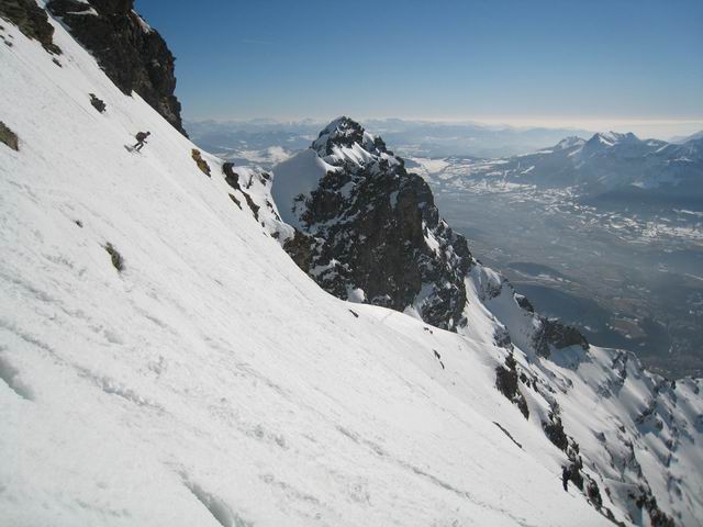 Même si ça n'était pas un objectif de longue date, c'est pour diverses raisons une belle satisfaction d'avoir pu repêter cet itinéraire ouvert par LTA et SMA en 2003. Ceux qui passent régulièrement dans le coin savent que cette face est rarement en condition, et quand l'est ça ne dure pas. Lio se désespérait de voir quelqu'un y retourner. Suite au repérage de mercredi au retour de [Pétarel->http://www.volopress.net/volo/sortie2728.html], la lacune est comblée. Pour le reste, c'est une course de 1er ordre, on passe d'un couloir à l'autre en traversant des balcons ultra panoramiques; l'exposition, bien que permanante, ne se fait pas trop sentir. Lio comparait ça au Grand Pic de Belledonne, c'est quand même moins étriqué, et grâce au couloir inférieur, c'est du grand ski de haut en bas, pas de doute on est dans les Ecrins !