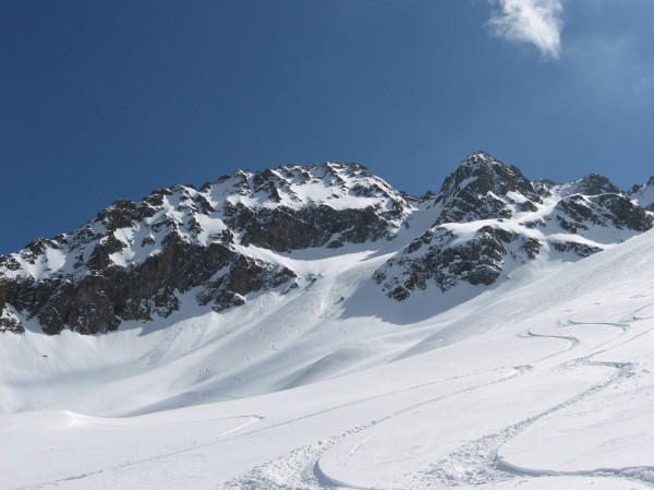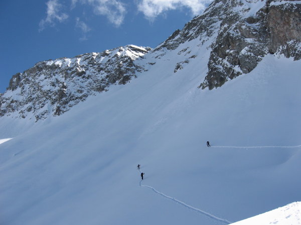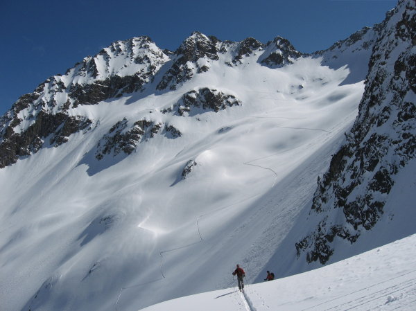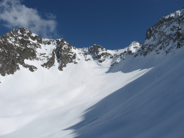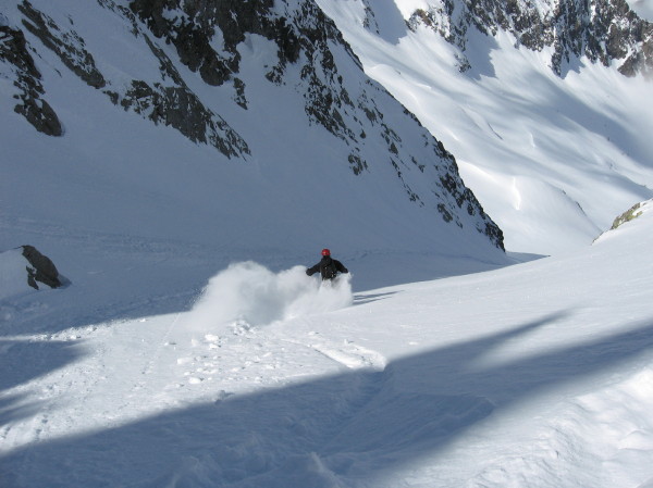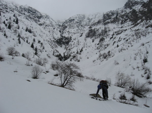 Encore un joli vallon sauvage effectivement bien défendu par des ressauts verno foireux: montée Rive gauche impec et descente rive droite au feeling (pas pu la repérer à cause du brouillard le matin). Ce jour ca passait bien. Neige extra et vue splendide. Seul bémol le brouillard bien épais qui monte dans l'AM: un peu déçus de pas avoir profiter de la bonne poudre plus longtemps dans la partie médiane de la dernière descente.
