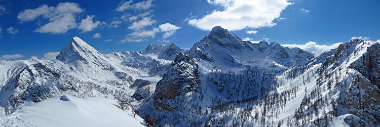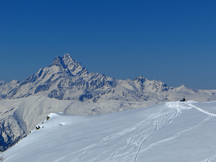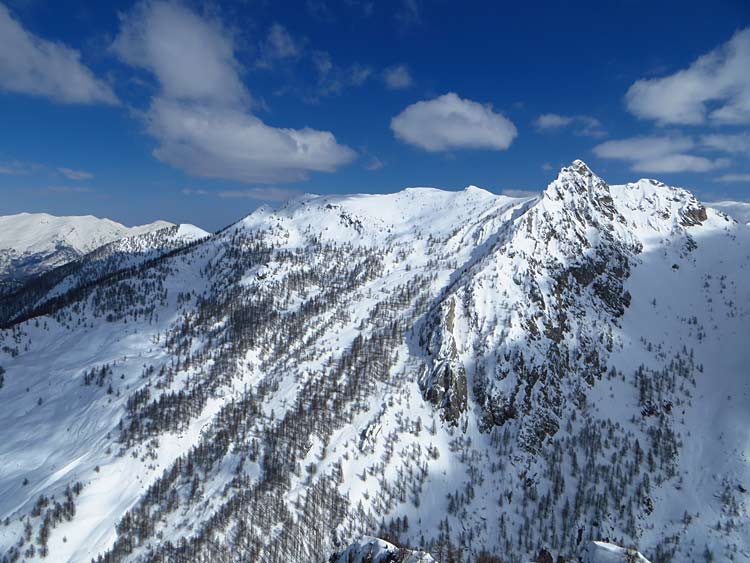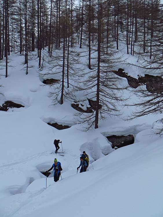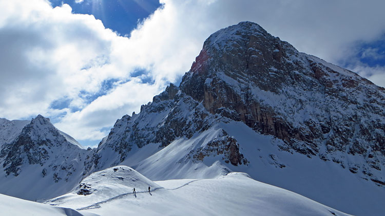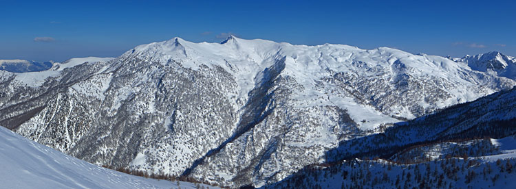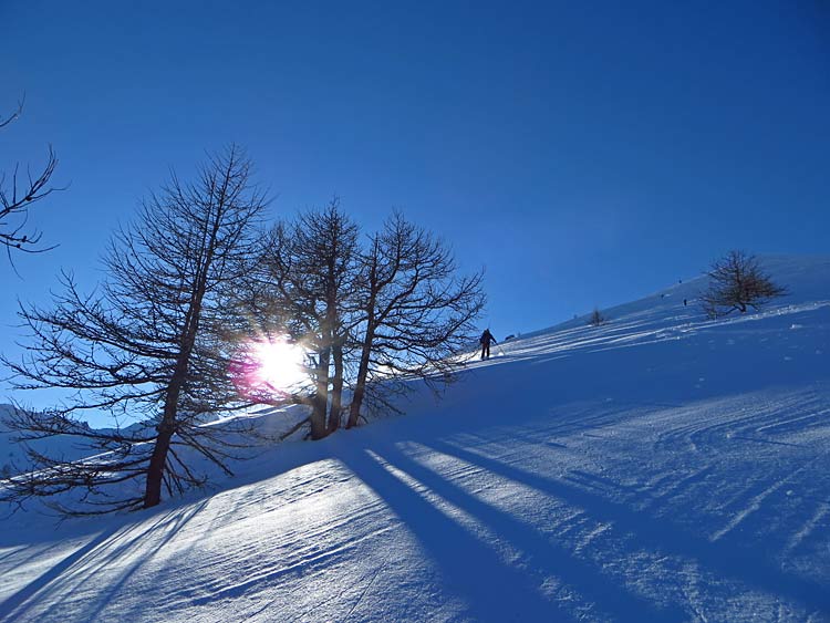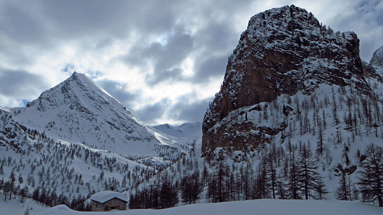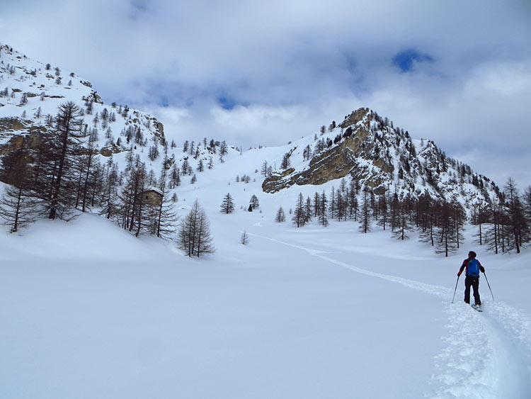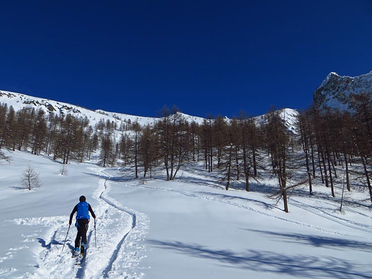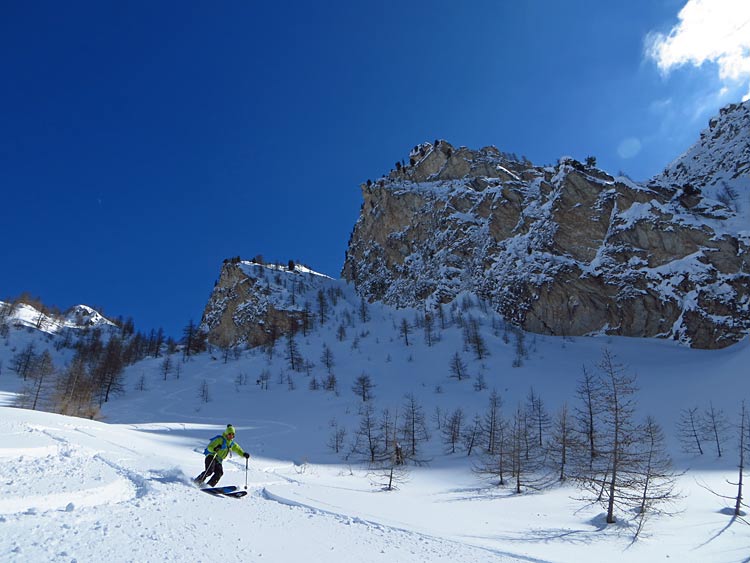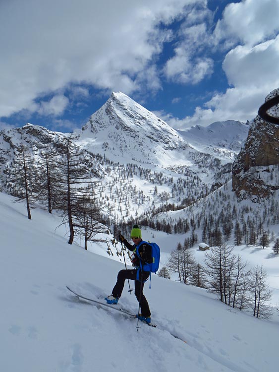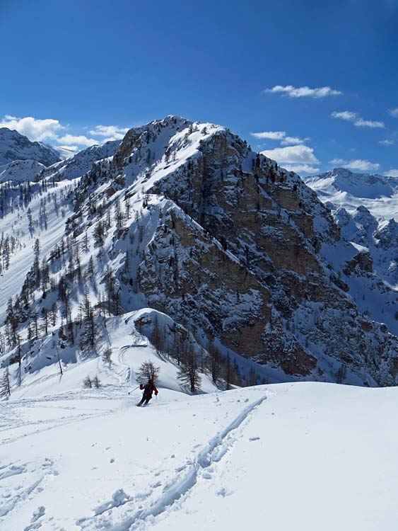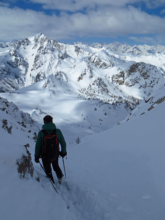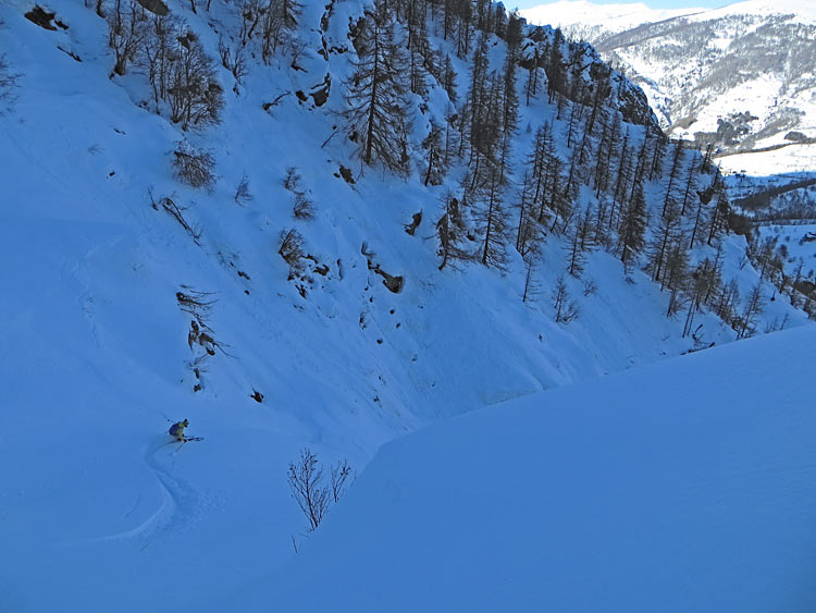 Deuxième journée en Val Maira avec un circuit bien varié alliant montées faciles et déjà tracées puis combes et petits couloirs vierges bien poudreux.