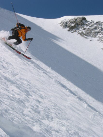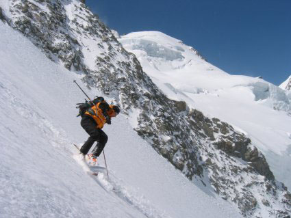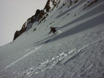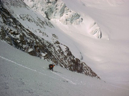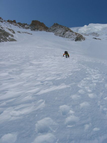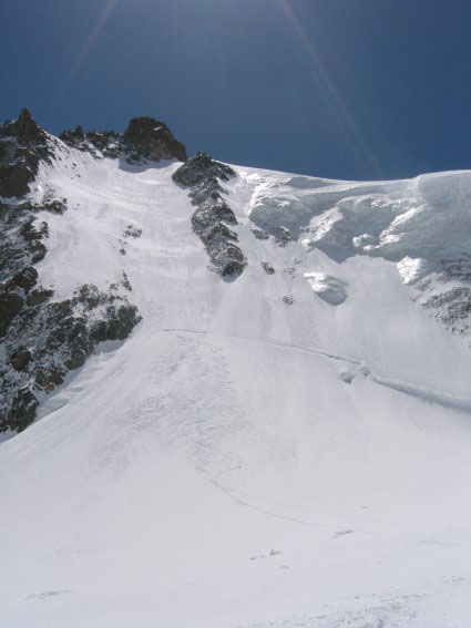 Boucle : montee classique jusqu'a la rimaye. Chaussage possible vers 2600 mais beton dans les goulets accedant aux glacier. Passage de la rimaye sans trop de probleme rive droite. Descente rive droite du glacier skis (surf) aux pieds jusqu'à 2270, moyennant quelques courts dechaussages. D+ : 1800. 5.2/AD/E2