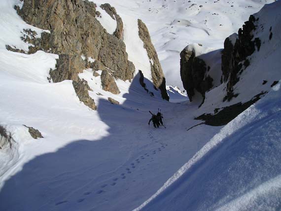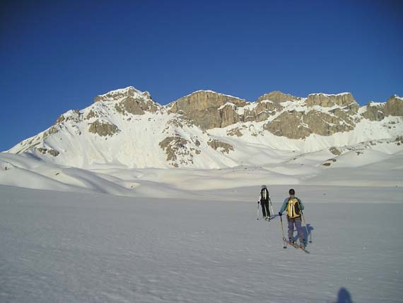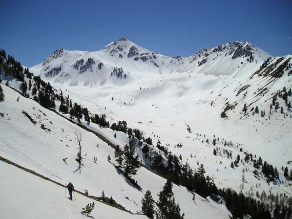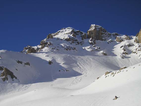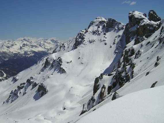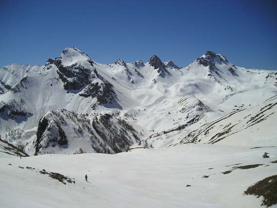 Après le but de la veille, c'est parti pour une grande virée en transfo dans des vallons inconnus pour nous: paysages magnifiques typiques du queyras, au milieu des falaises de calcaire qui réveillent nos instincts de grimpeurs. Une vue panoramique exceptionnelle et un temps splendide, 3 vallons déserts traversés: c'est ça aussi le ski de rando plaisir!