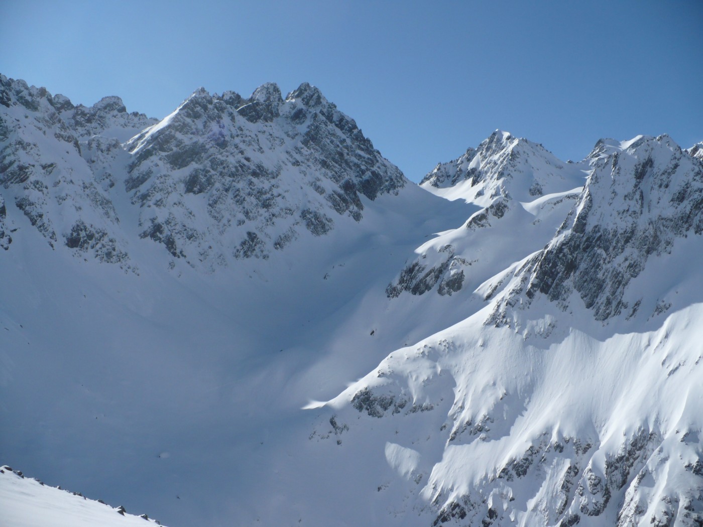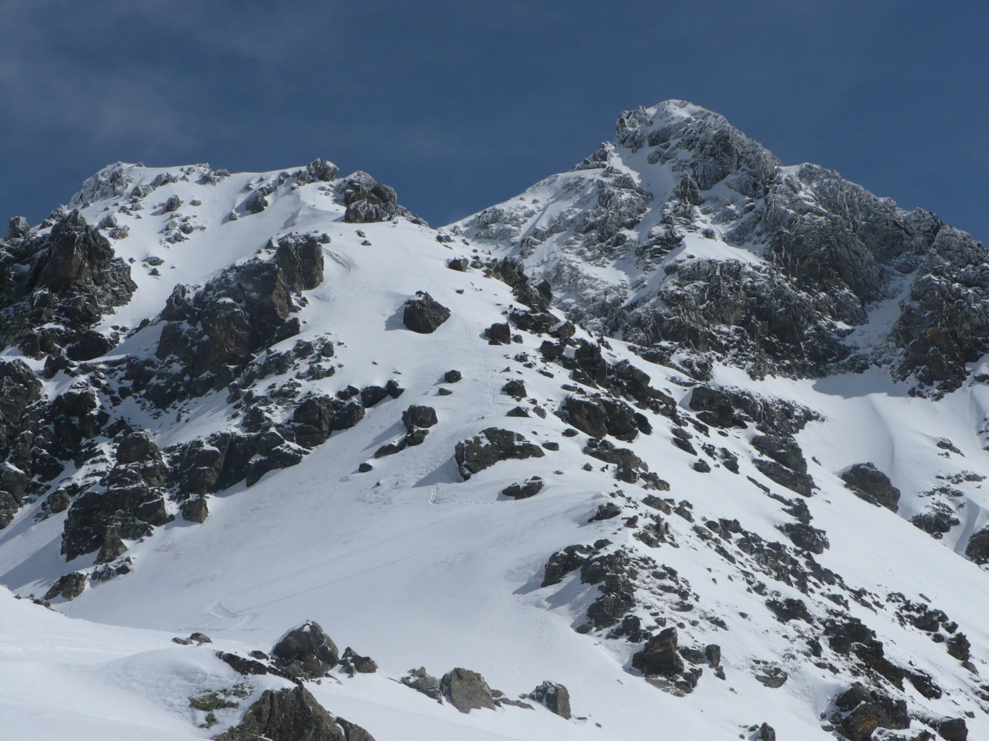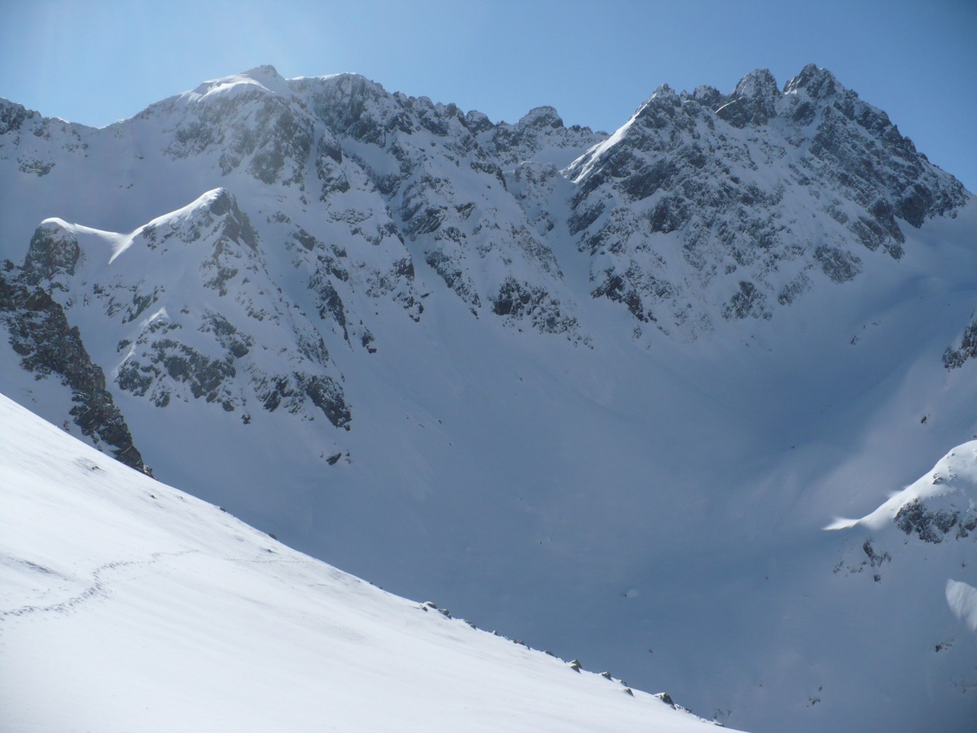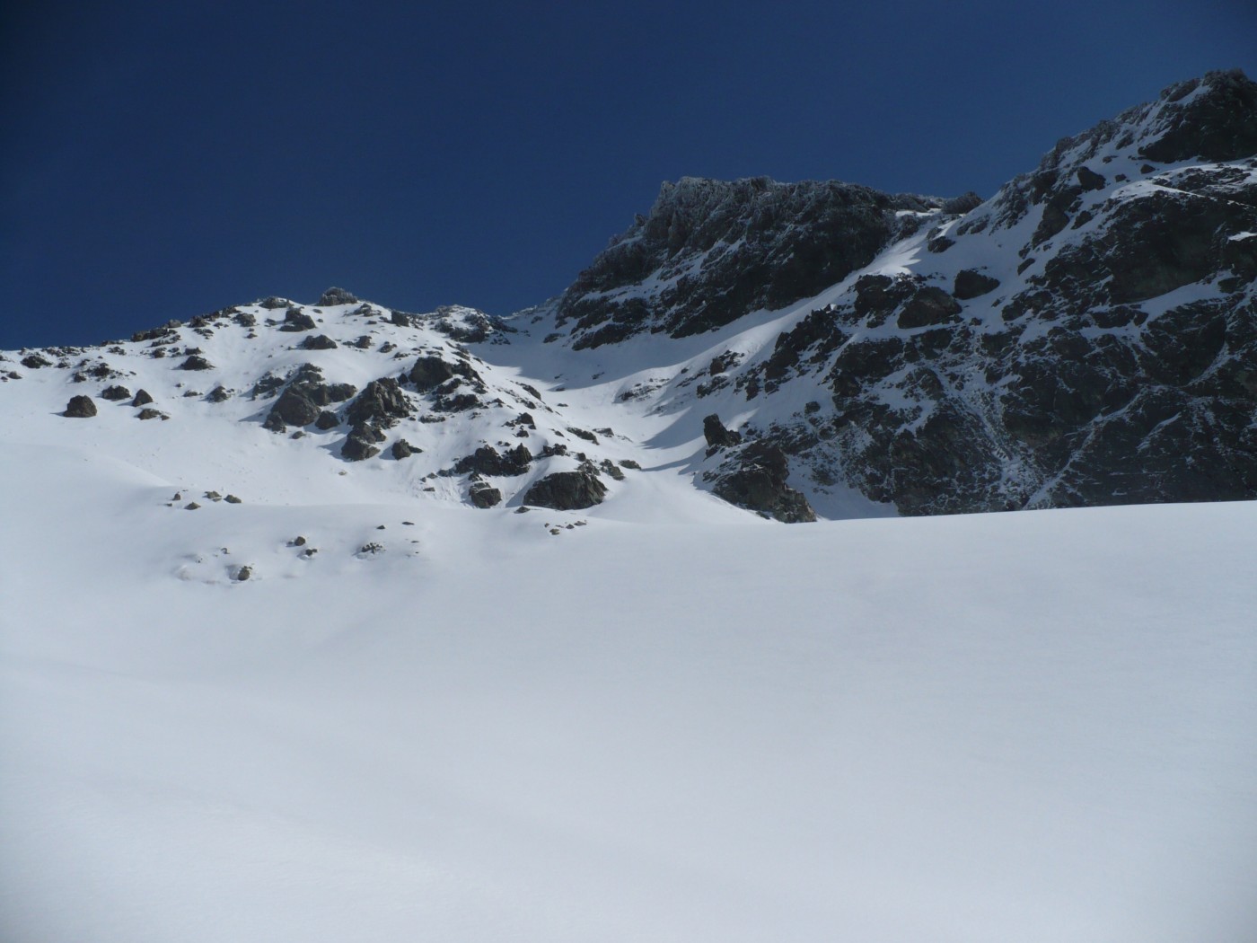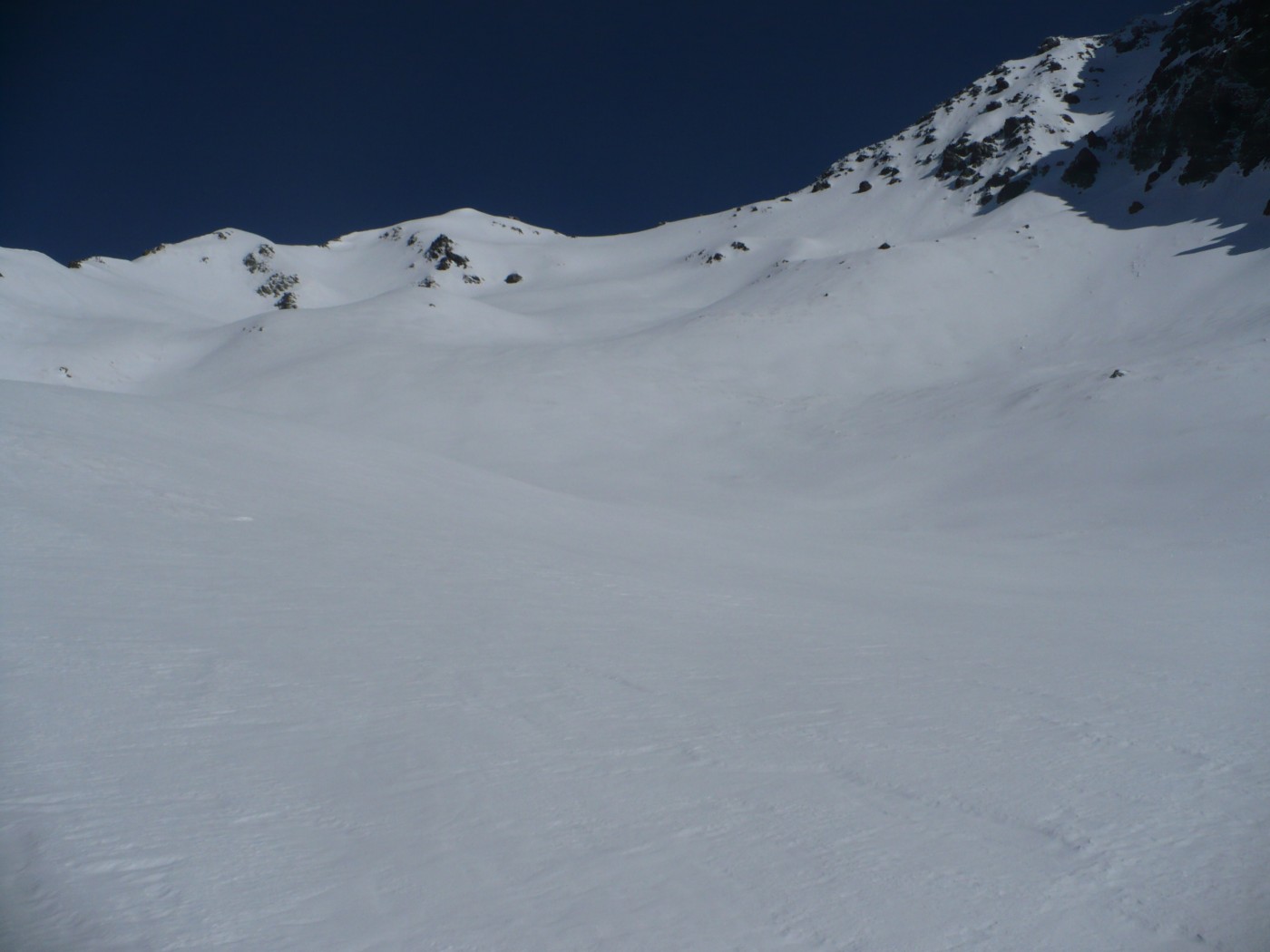 Quand on aime, on ne compte pas !!! Retour dans le secteur pour un autre itinéraire. 4 personnes au départ pour le Rocher Blanc, puis seul sur l’itinéraire du Bec d’Arguille. A la Marmottane, je rejoins la combe sud vierge de traces ; de visu, le couloir sud/ouest me parait peu fourni en neige récente, et la sortie est inskiable, alors je continue jusqu’au replat du passage Brabant où je laisse les skis pour remonter à pieds l’arête ouest, facile et esthétique, jusqu’au col à 2800 m ; accueilli par des rafales de vent violentes annonçant le mauvais temps, je continue jusqu’au gros rocher barrant l’accès au sommet ; la corniche et le couloir terminal en cailloux me dissuadent de faire les derniers mètres jusqu’au sommet. Descente de l’arête avec quelques éclaircies, puis ski de cette belle combe en super neige, à peine réchauffée. Retour par la Combe Madame avec une neige encore froide.