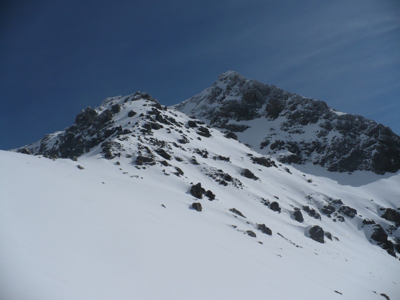 On chausse toujours à 1400 m dans la 1ère clairière ; les quelques cm de neige tombés cette semaine ont recouvert partiellement les traces jusqu’à 1900 m. De alt 2030 m à 2650 m dans les pentes sud, on trouve 10 à 40 cm de neige récente, constituée de 5 à 10 cm de grains fin en 1ère couche, puis de neige roulée. Sur l’arête, début en croûte gelée épaisse et cassante, puis alternance de grains fins et de neige dure.