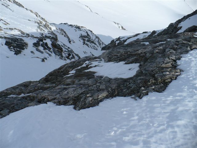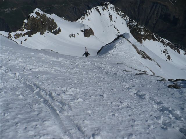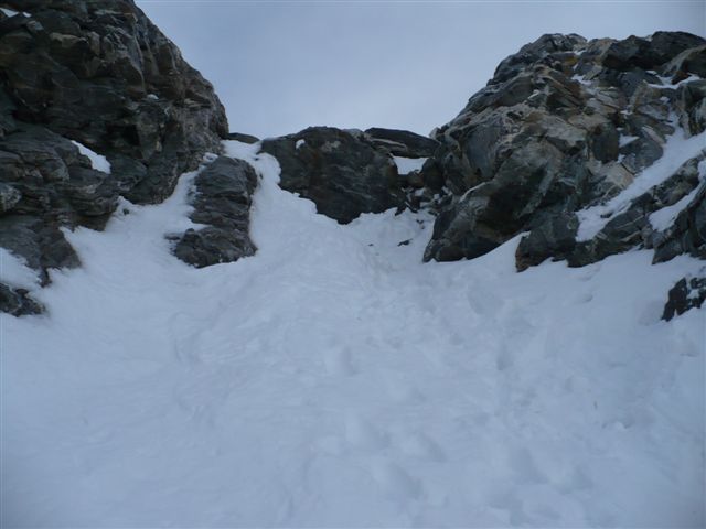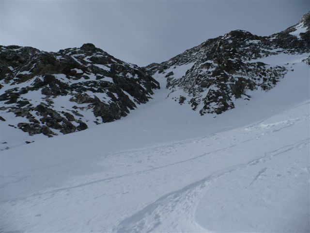 Bonne condition de régel hors forêt.Le couloir à 3100 m se passe plutôt à pieds; l'étroiture au milieu du couloir ne dépasse pas les 150 cm ; et la sortie se fait par un " petit pas de danse " en II. A la descente, bonne poudreuse dans la partie terminale et dans les zones ombragées, ailleurs poudreuse réchauffée et neige de printemps, voire d'été en bas.