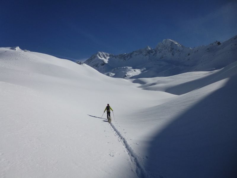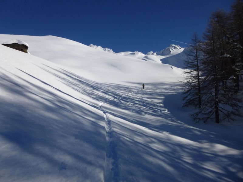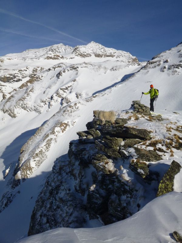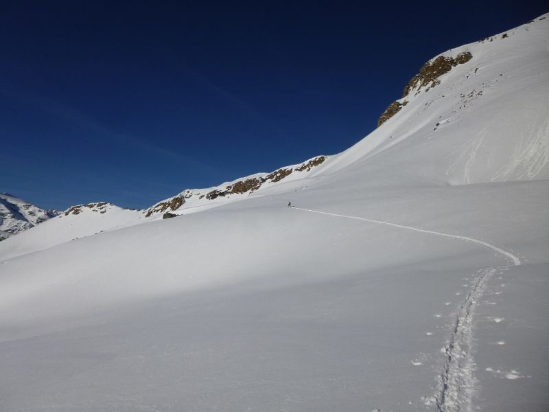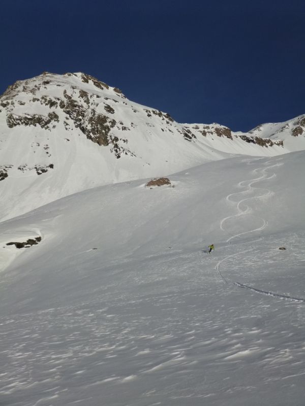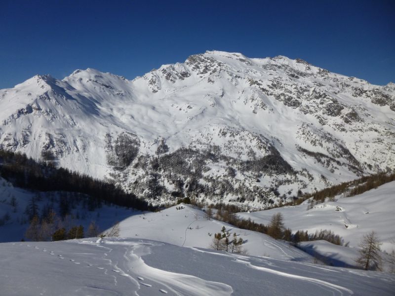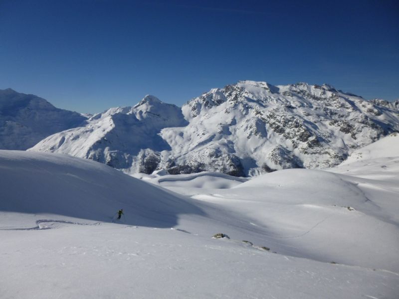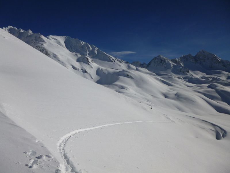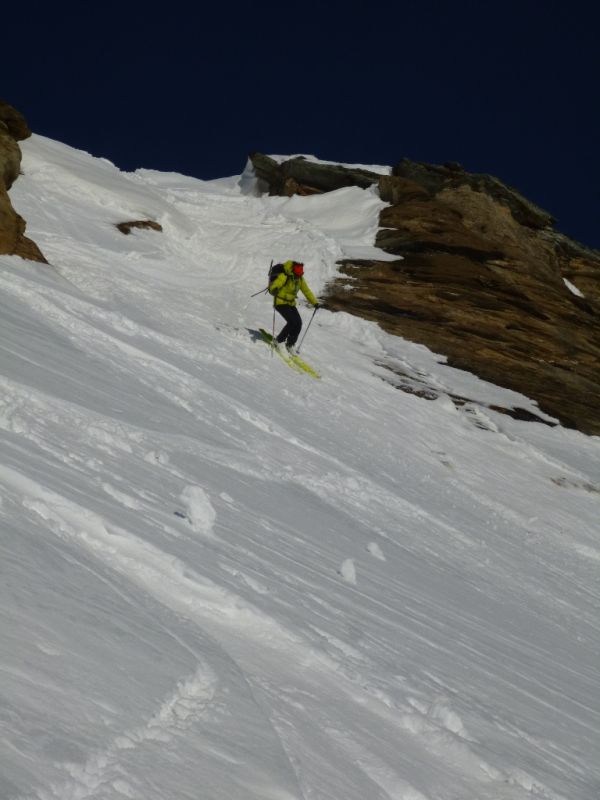 Neige croutée jusque vers 2100m puis poudreuse un peu ventée. Quelques plaques parties naturellement dans la face sud-est du Ruitor et de l'Arp Vieille. La neige partait en coulée sous les skis dans le haut du versant sud de la Becca dei Quattro Denti.