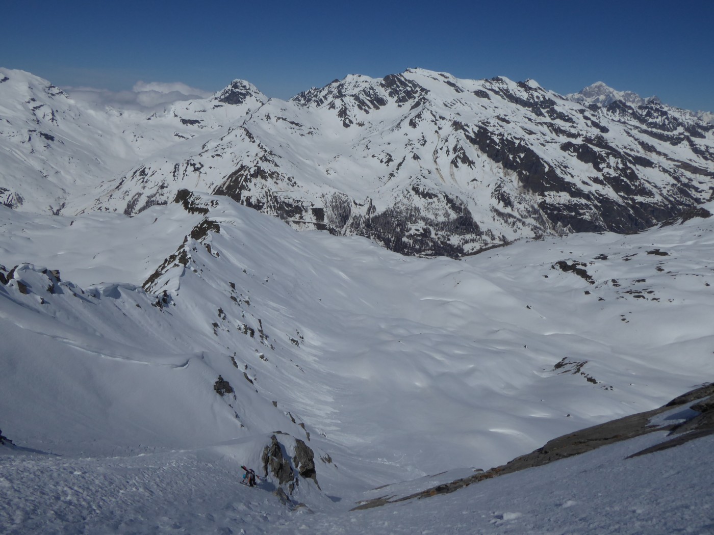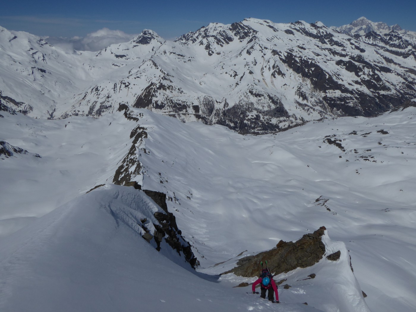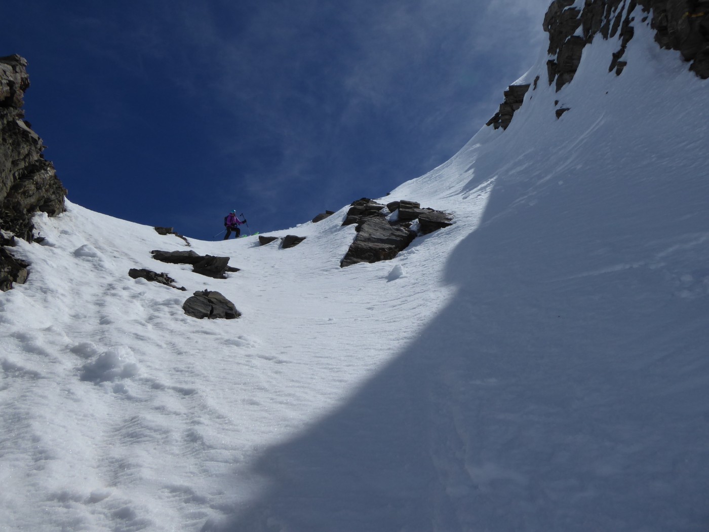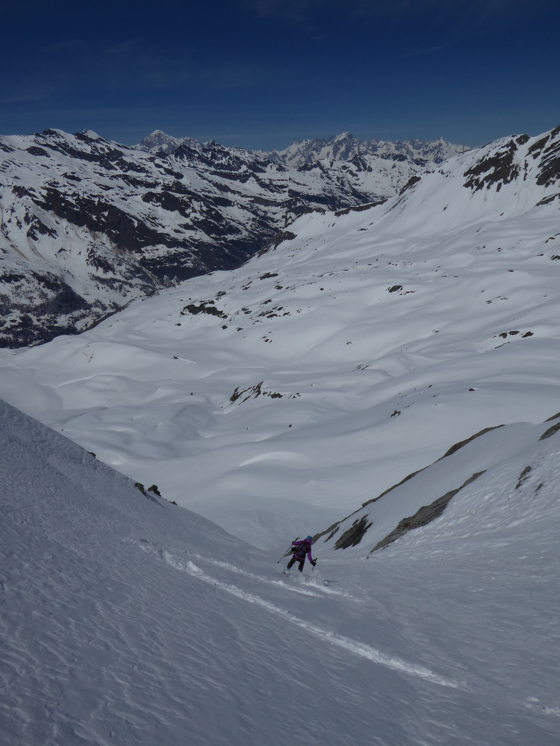 Regel encore moins bon qu'il y a deux jours. La neige était vraiment ferme au-dessus de 2400m à la montée. L'arête ouest de la becca di Tei était en neige transfo dure. Dans le couloir NO, un peu de poudre, de la croute assez bonne à skier, de la neige dure. Peu d'évolution de la neige au-dessus de 3000 m en raison du vent d'ouest.