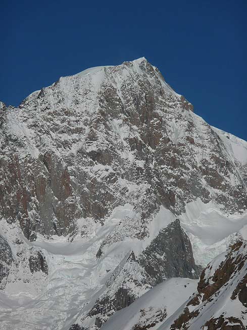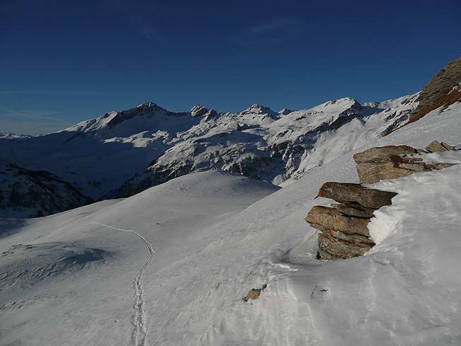 Remarquable descente panoramique : 1100 m de pente à 35° en moyenne avec un petit replat intermédiaire. Bonne qualité de ski même si ça gagnerait à être mieux transformé ; en revanche, c'était dur pour les cuisses à l'heure où je suis descendu (10h30 - cause timing) en raison de l'absence de dégel.