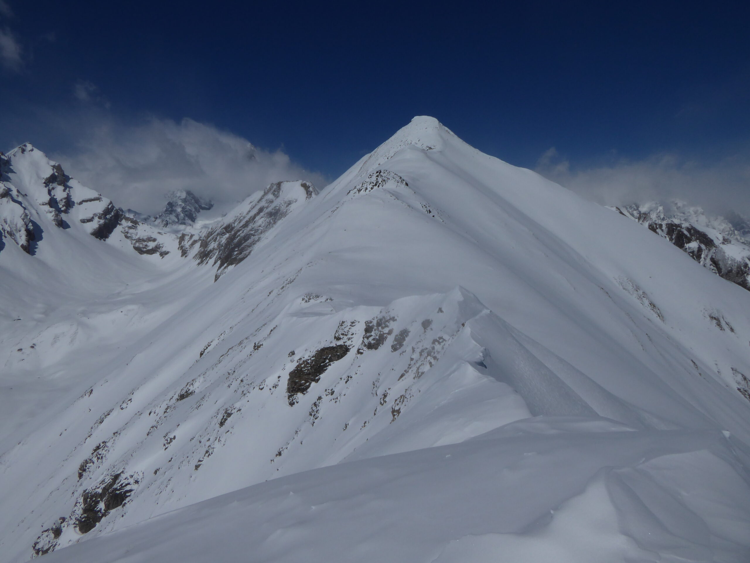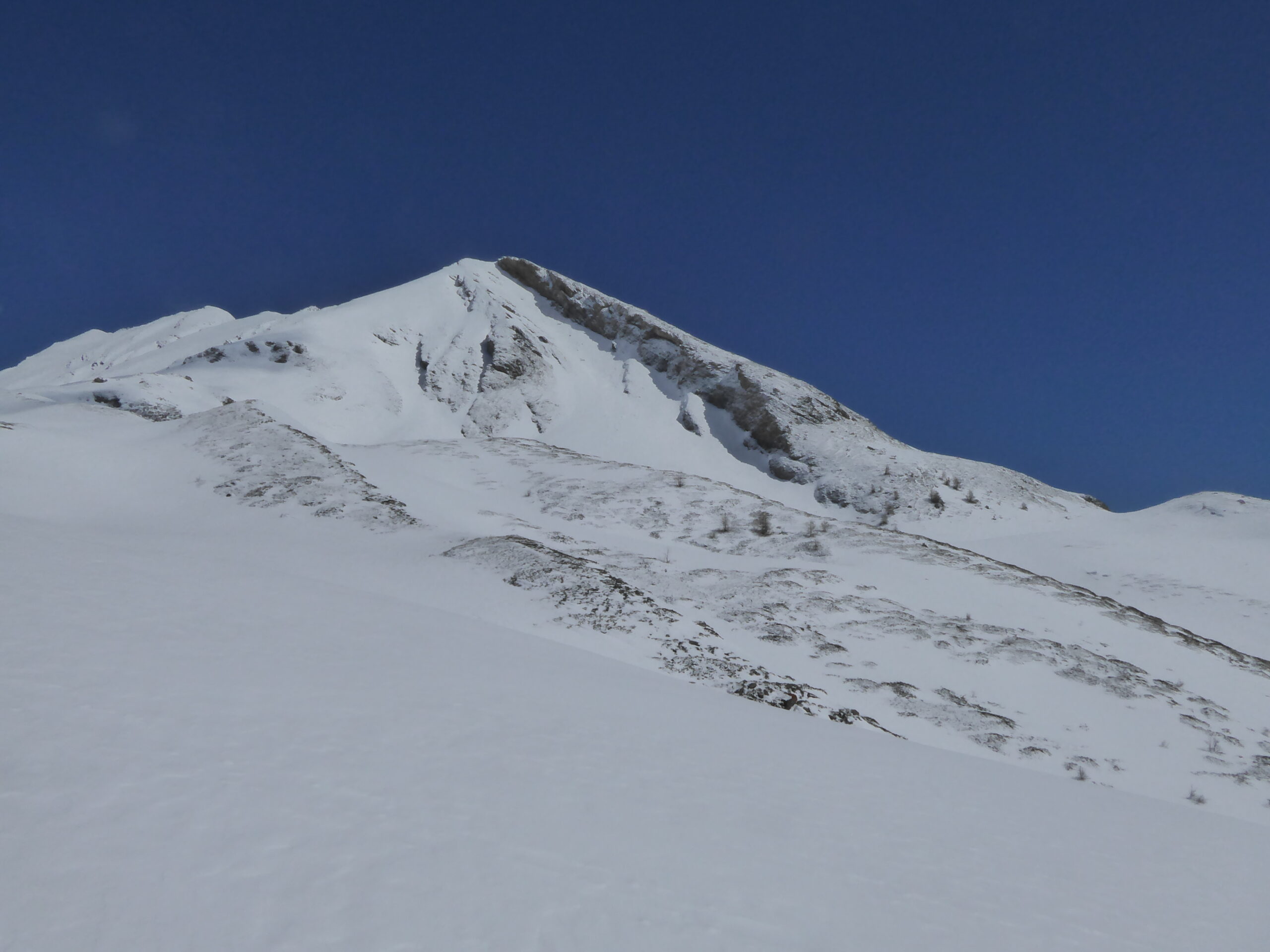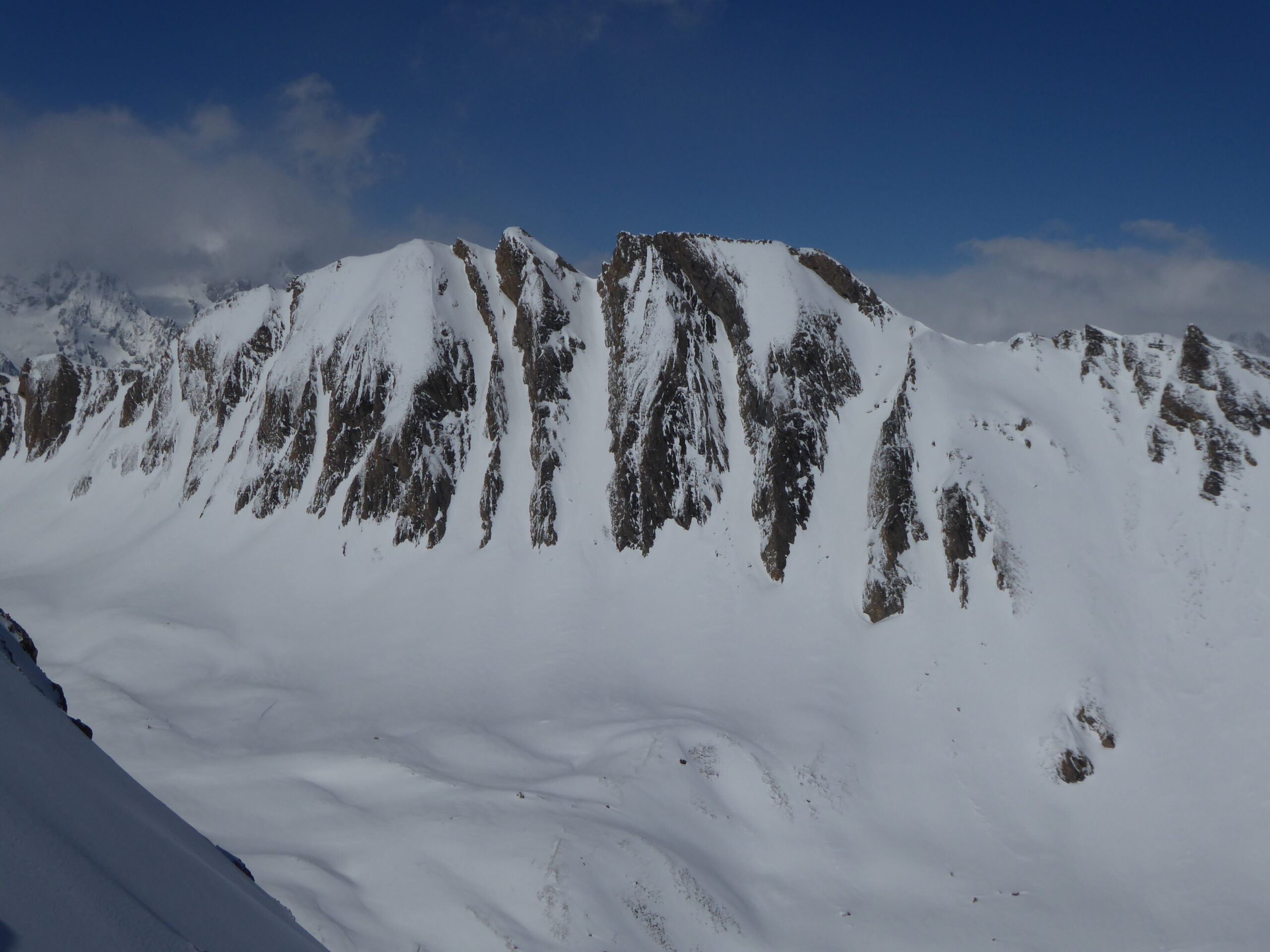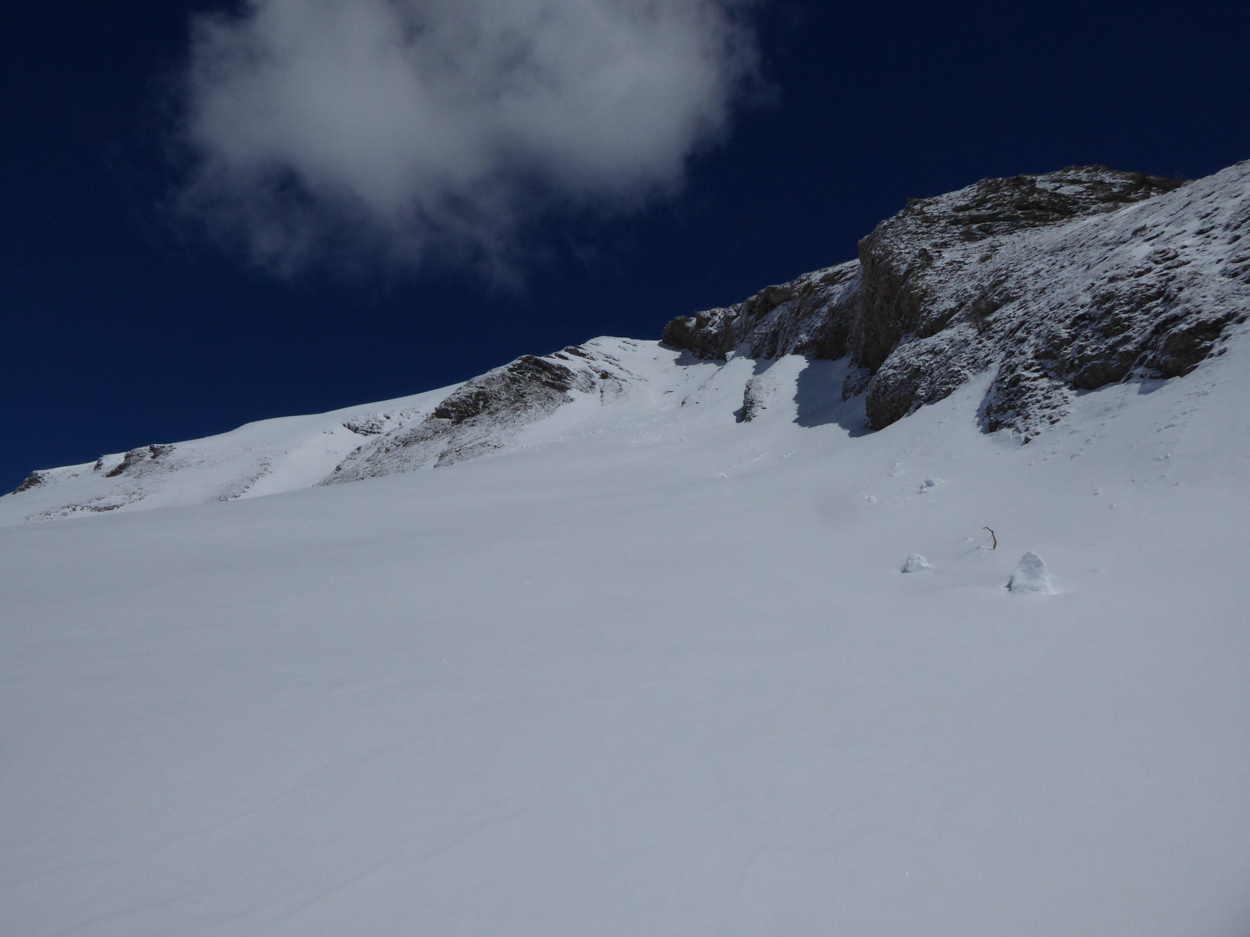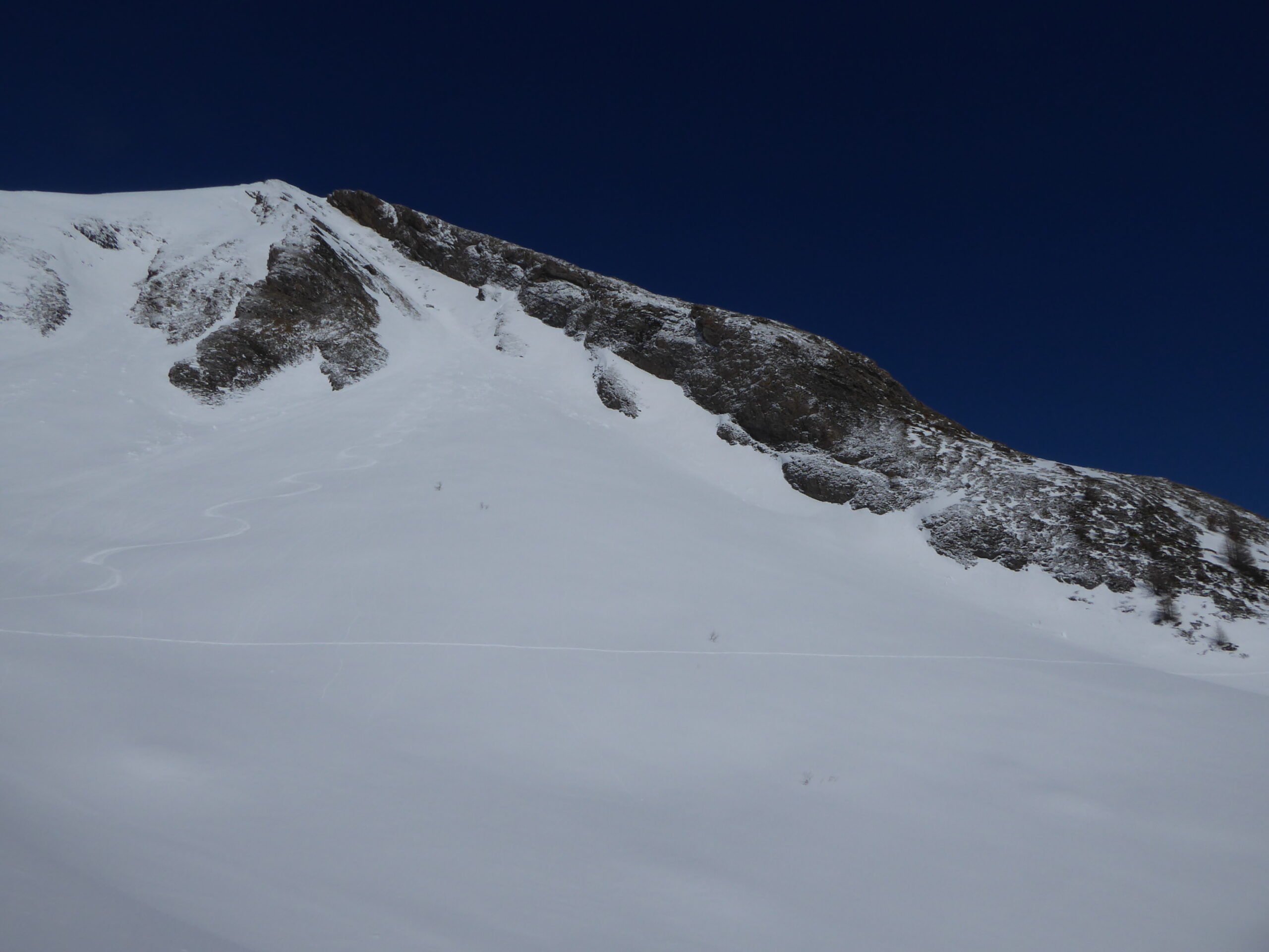 Il a moins neigé ici qu'à Chamonix : de 2 à 10 cm. Avec le vent, au-dessus de 2400 les accumulations vont jusqu'à 30 cm sur un fond en général dur dans ces orientations sud parcourues. Quelques coulées de surface au passage des skis dans le haut de la rampe SO.