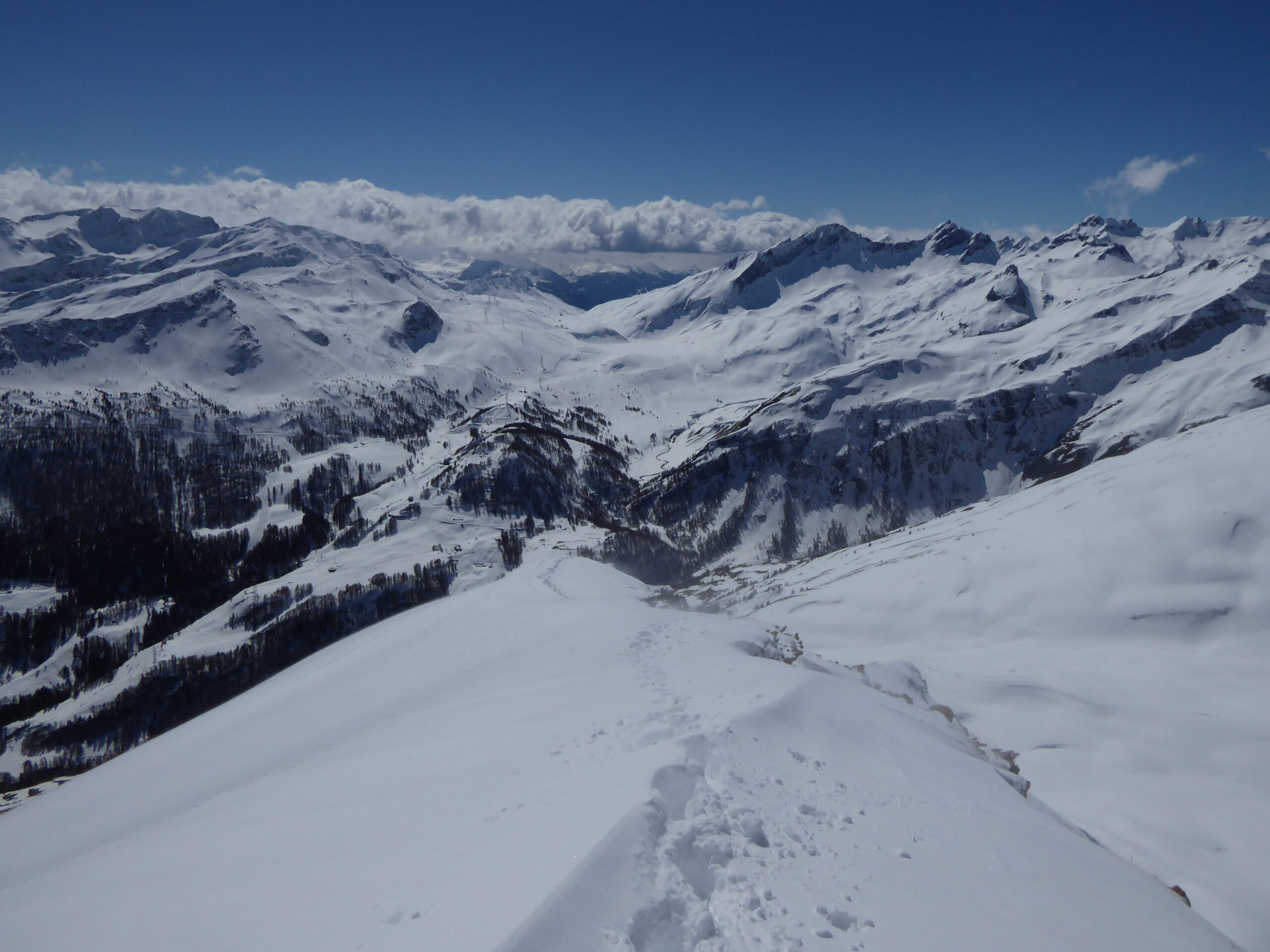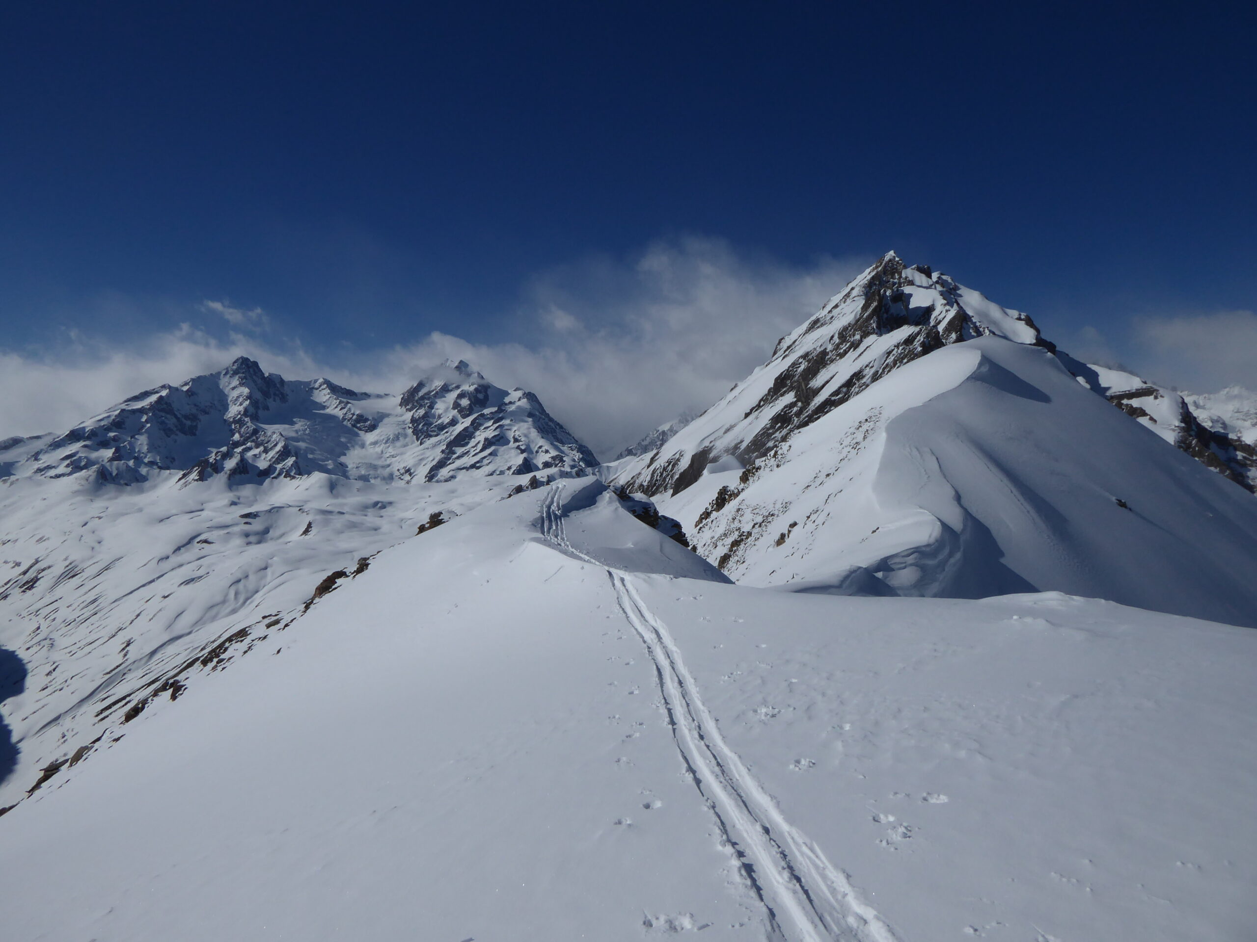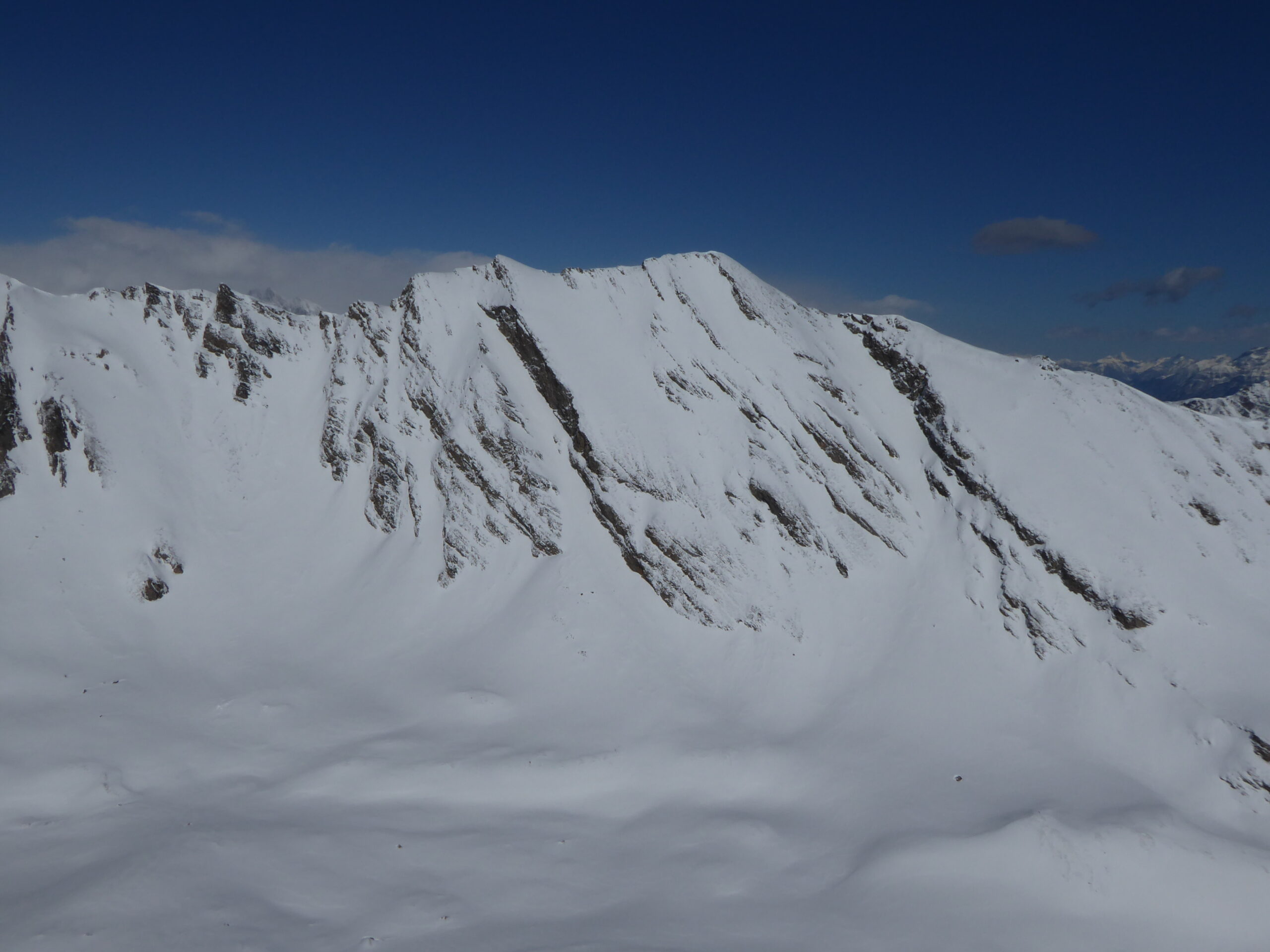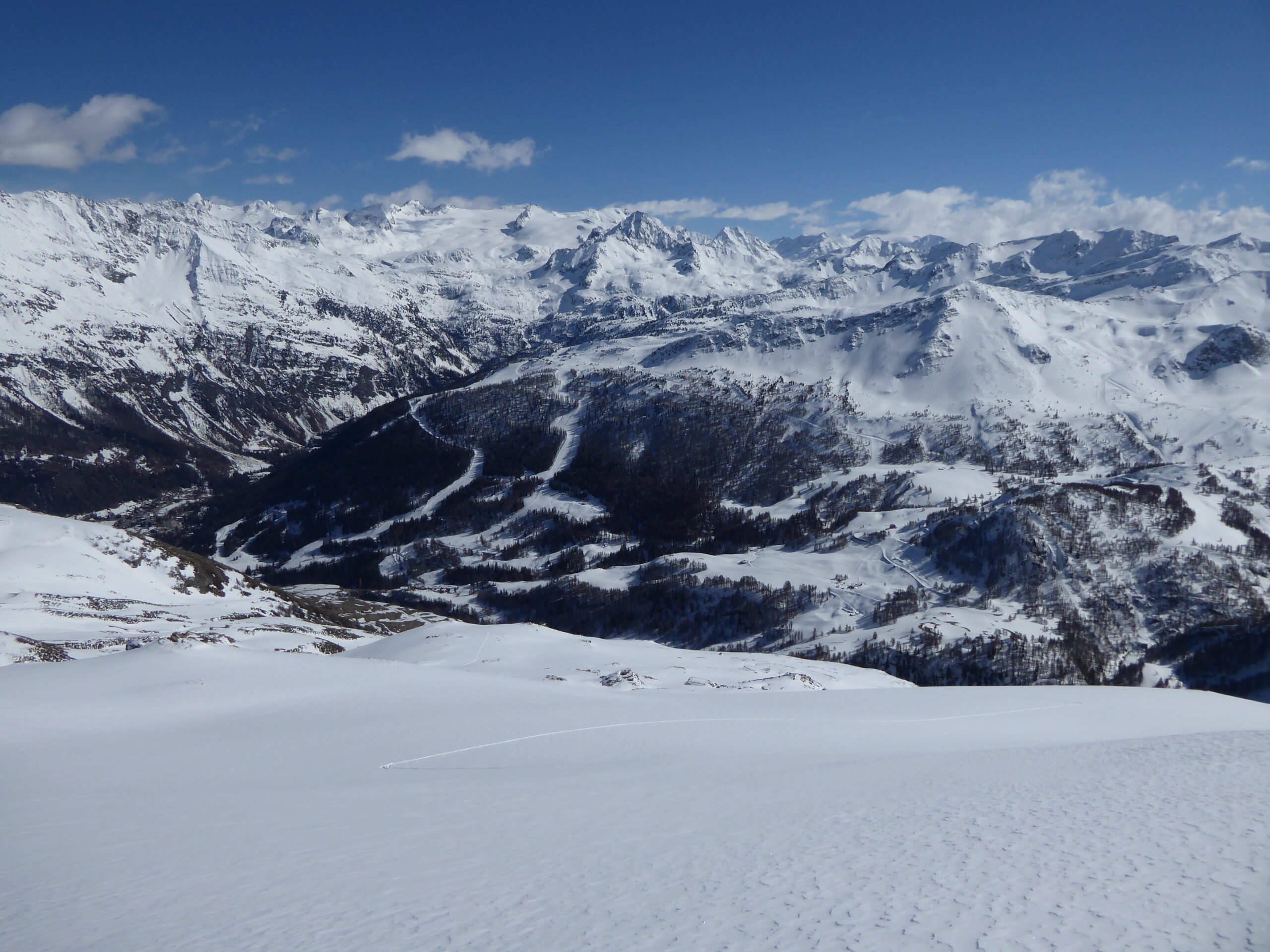 Je voulais skier la face sud du Belleface S. Après l'avoir remontée à pied par son bord gauche partiellement enneigé, j'ai eu des doutes sur la stabilité des larges pentes S de cette face. Je me suis rabattu sur la rampe SO qui avait déjà en partie purgé. Bon ski dans la rampe quand même et très bon ski dans les pentes SE du Combe Varin. On chausse sur la route des Orgères à 0,2 km du parking, juste un déchaussage de 0,1 km avant d'atteindre les Orgères. Vu un bouquetin, deux chamois et une colonie de chocards. 2/3 rotations d'hélicos au loin vers le Miravidi.