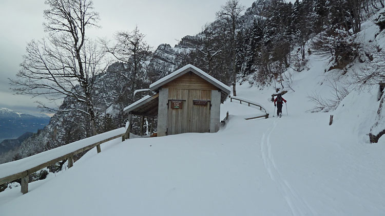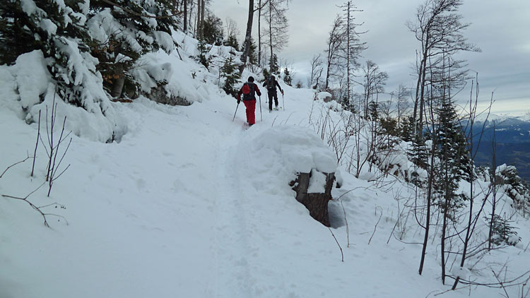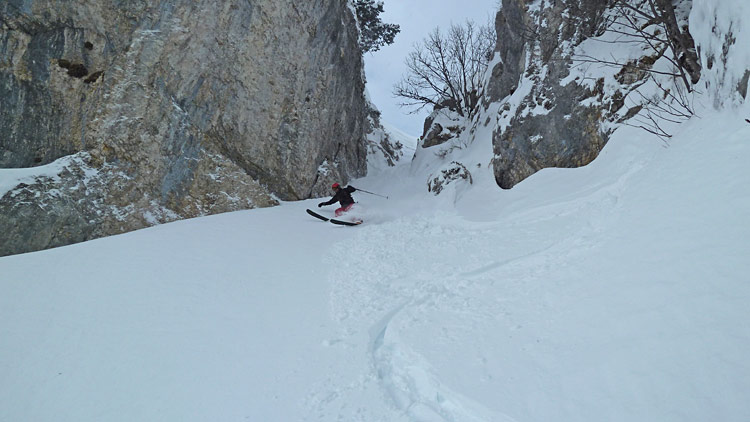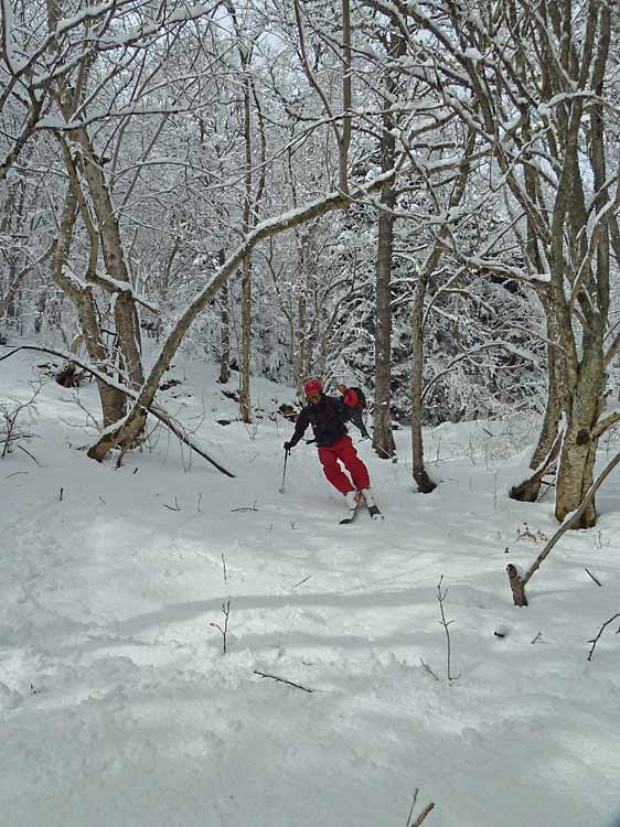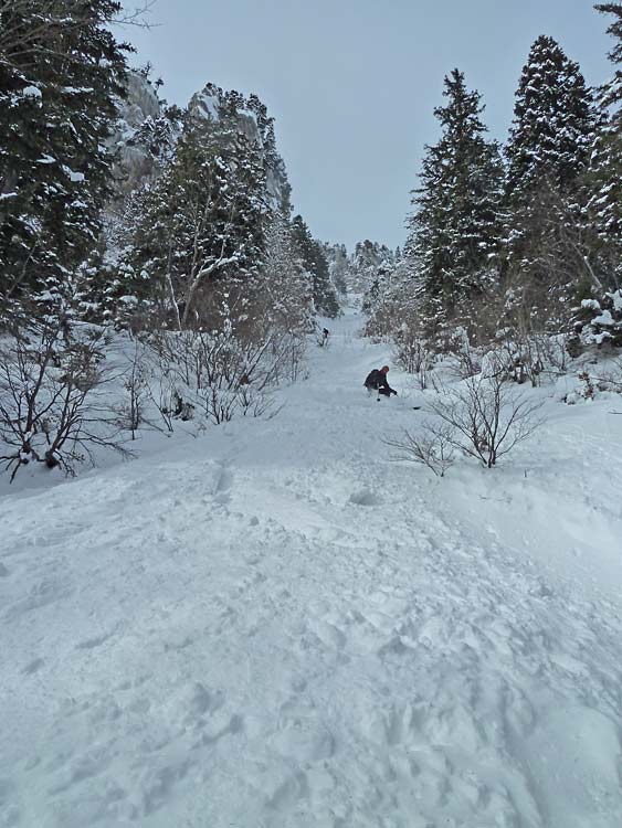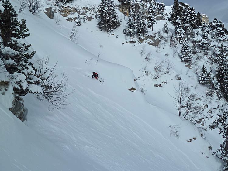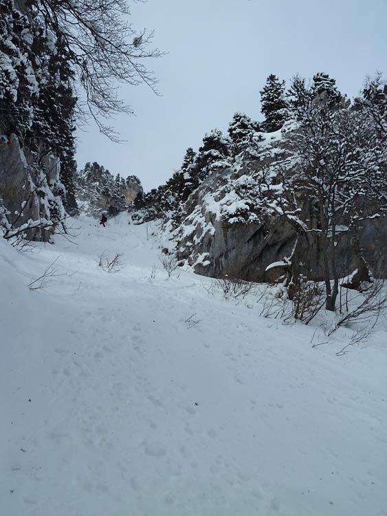 La neige y est un peu plus travaillée et un peu dense par endroits. On continue piano et à la sortie des difficultés pour les deux premiers (cône du couloir en forêt), le troisième décide de les rattraper en faisant du toboggan sur une petite coulée déclenchée à son passage.
