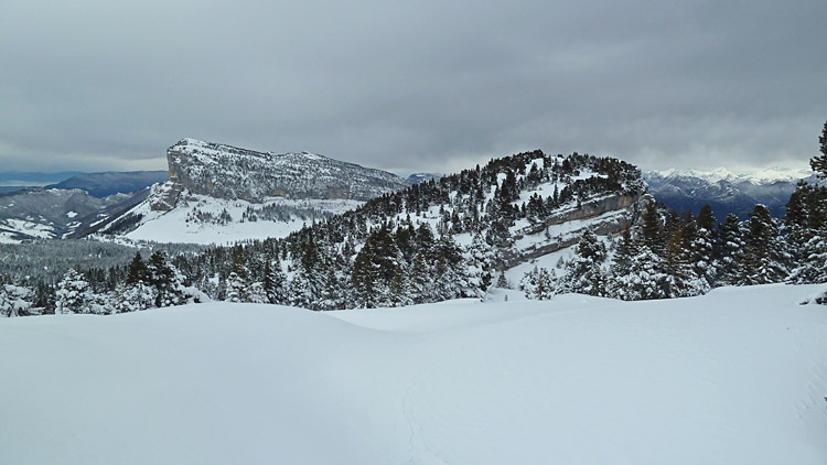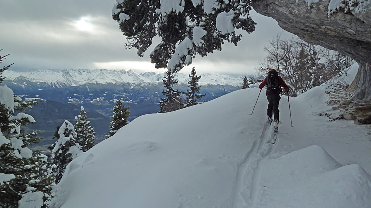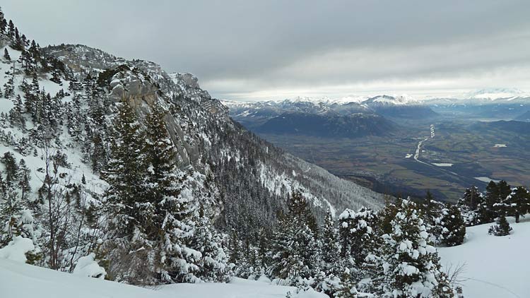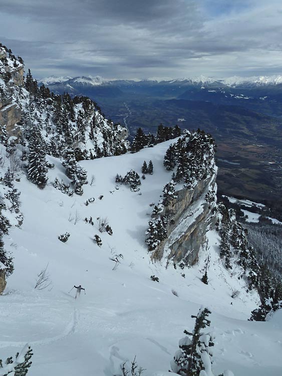 On descend tour à tour prudemment dans une bonne neige en rive droite du couloir principal, puis voyant que le bas a été massacré par le vent (+ une coulée ancienne) on change de couloir en passant au N de la proue.