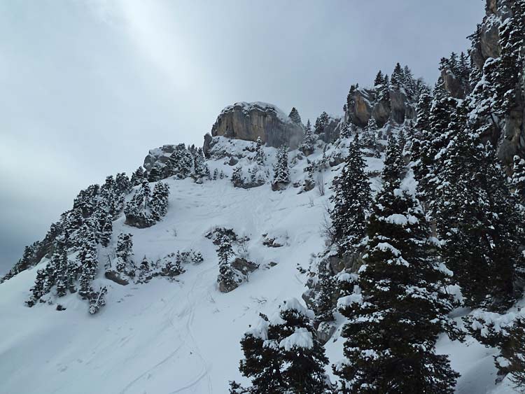 Une coulée déclenchée (par le dernier à passer...) dans le couloir au nord de la proue vers 1650 m.
