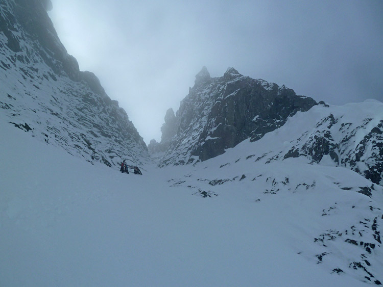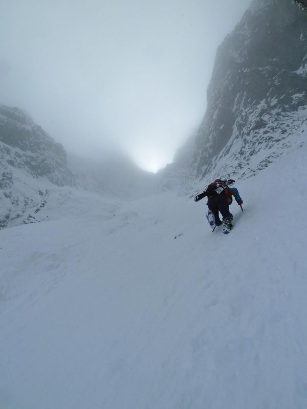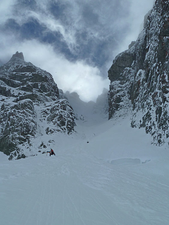 La cotation 5.3 semble plus adaptée que le 5.4 proposé dans VAN. 45 à 50°/350 m. La rimaye est assez importante et se passe moyennant une bonne enjambée.