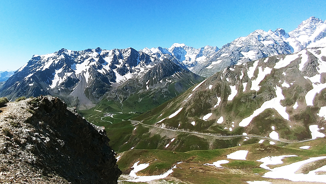 Depuis le mémorial une montée sur l'épaule (2750 env) du Petit Galibier ouest. Pas de passage enneigé pour rejoindre E1, d'où tentative dans la combe intermédiaire. Stop 2620 et retour puis l'arête.