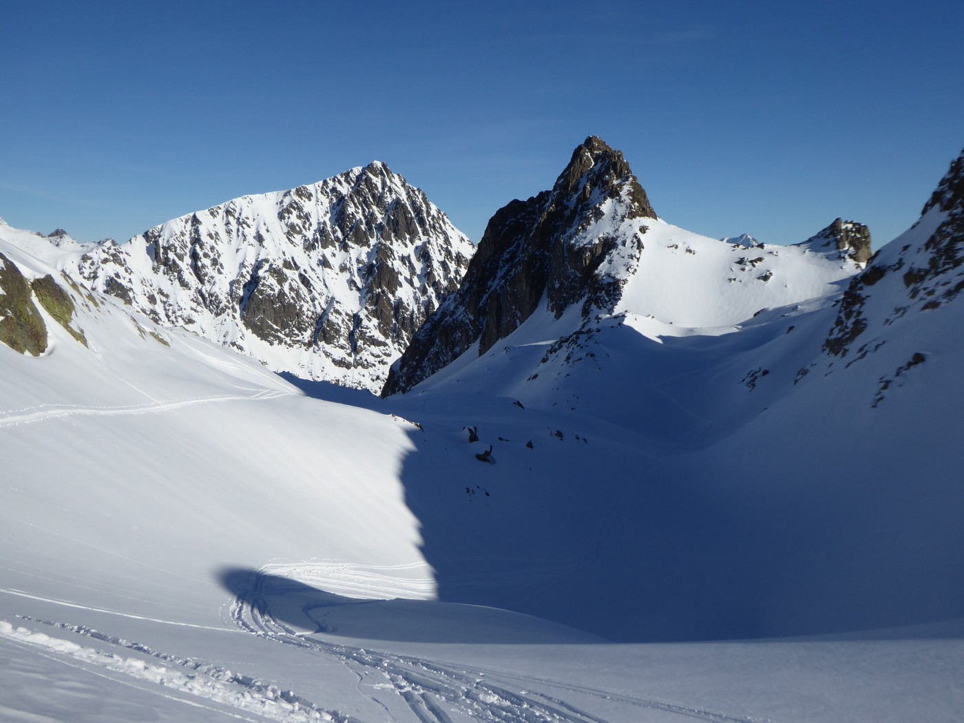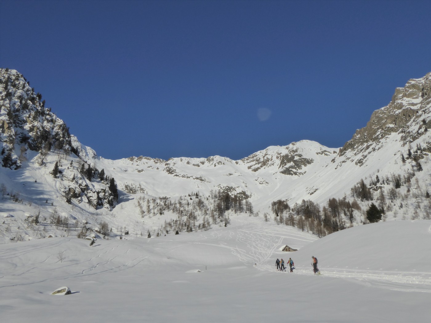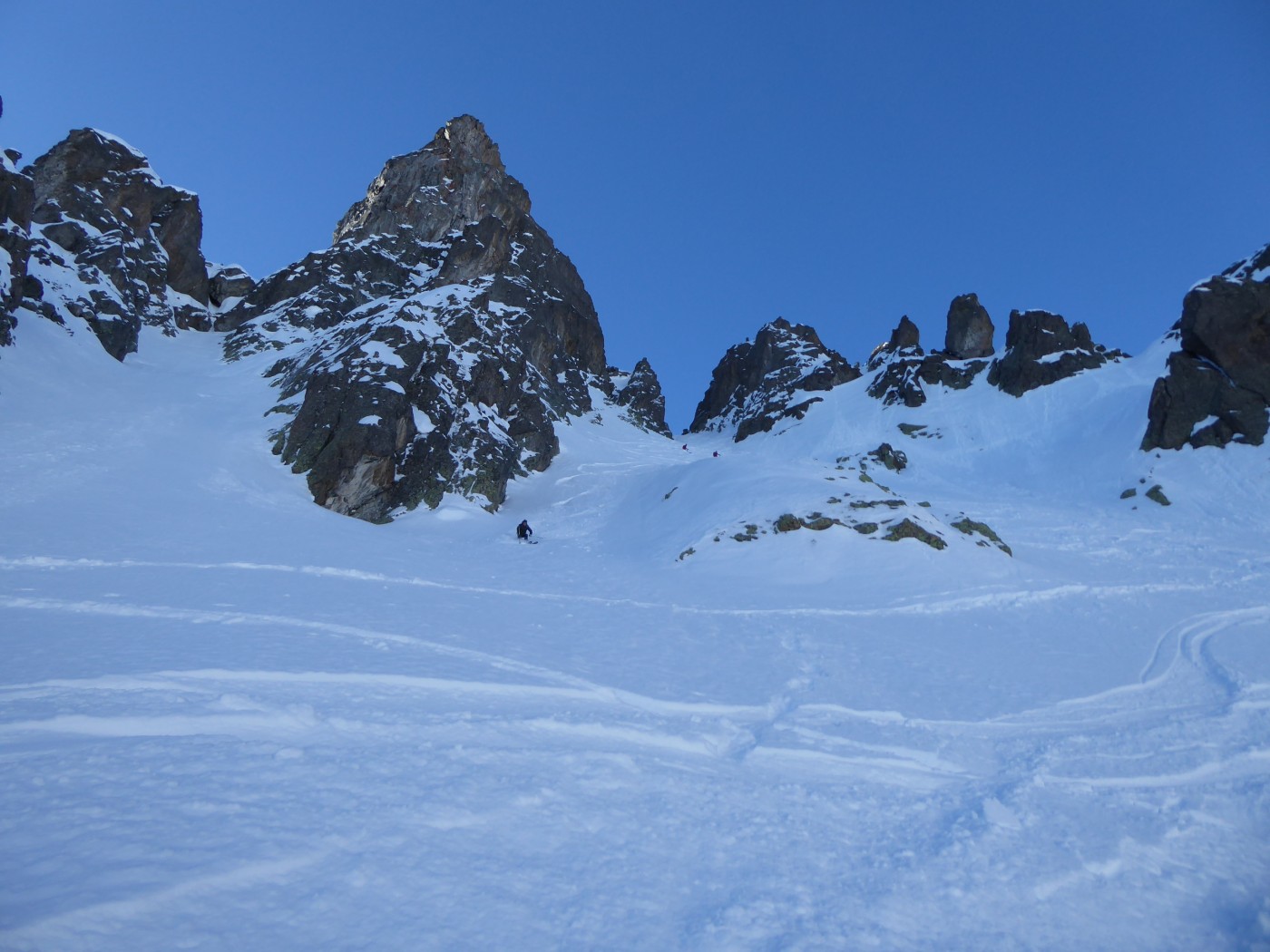 Beaucoup de monde à Bel Oiseau (C11). Le couloir NE (C12) est tracé mais pas la face E (C13.2) ni le couloir ENE (C12.2). Moins de monde côté col de Fenestral. La Comba Rossa et le couloir E de l'épaule sud ont été tracé peu de temps avant nous. Bon enneigement dans la forêt pour monter à l'alpage de Fenestral.