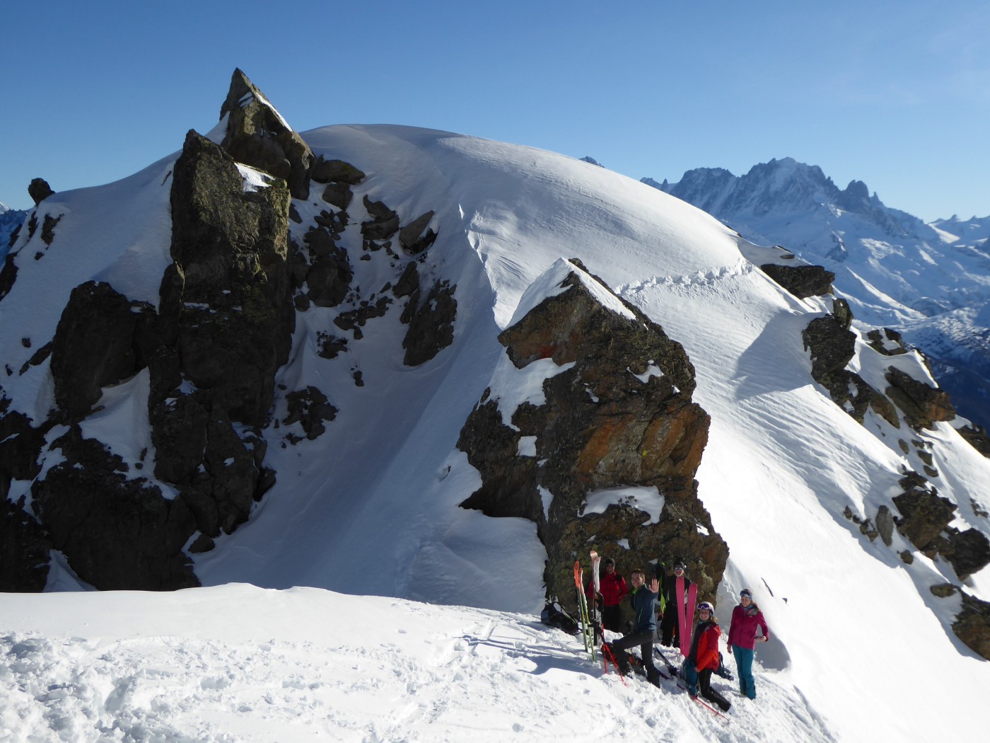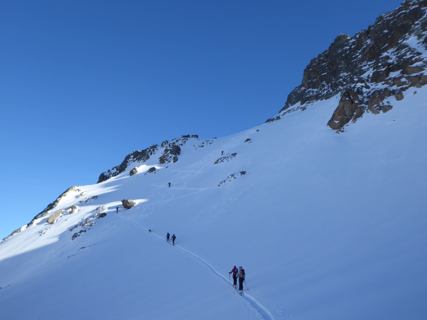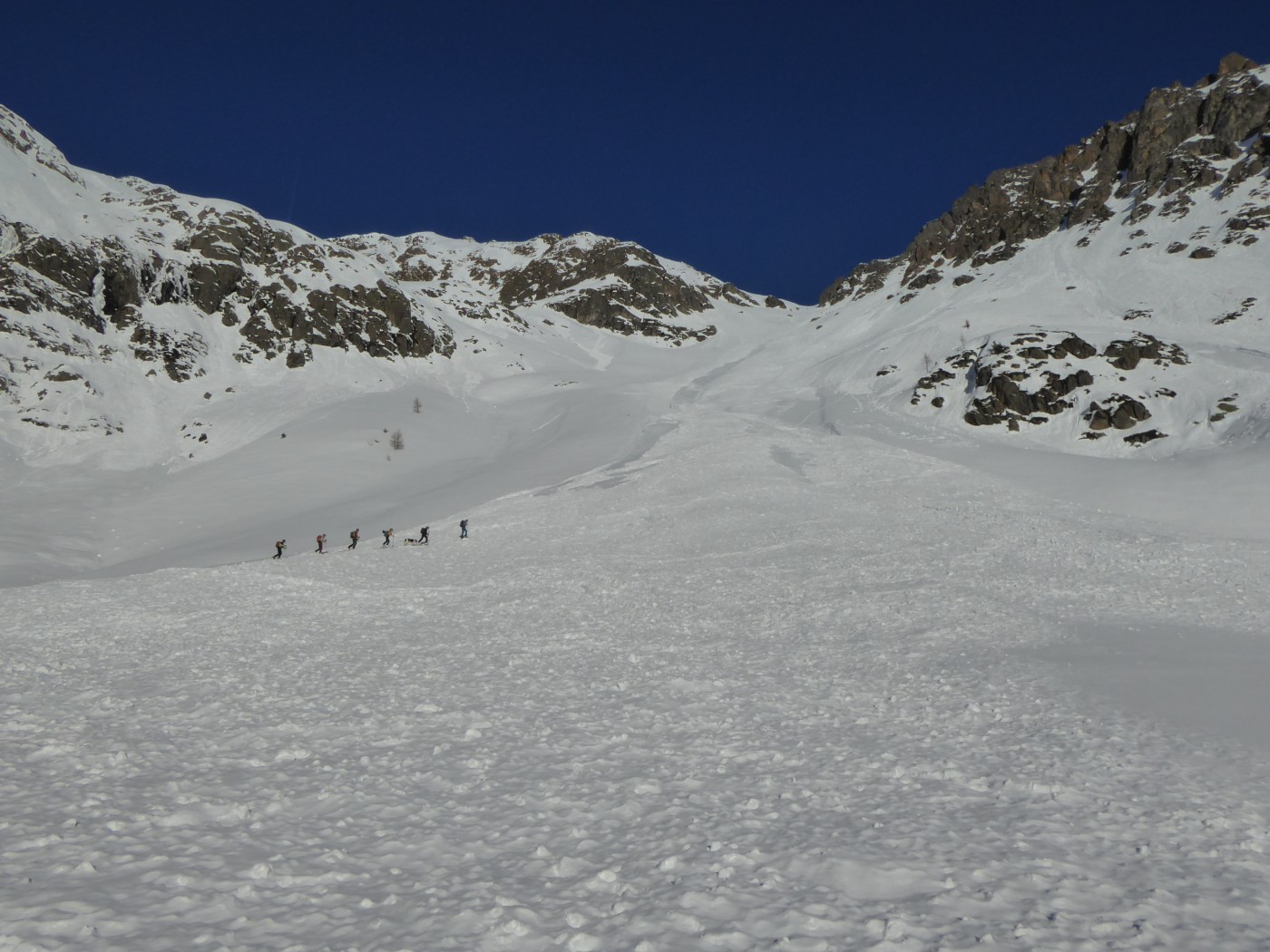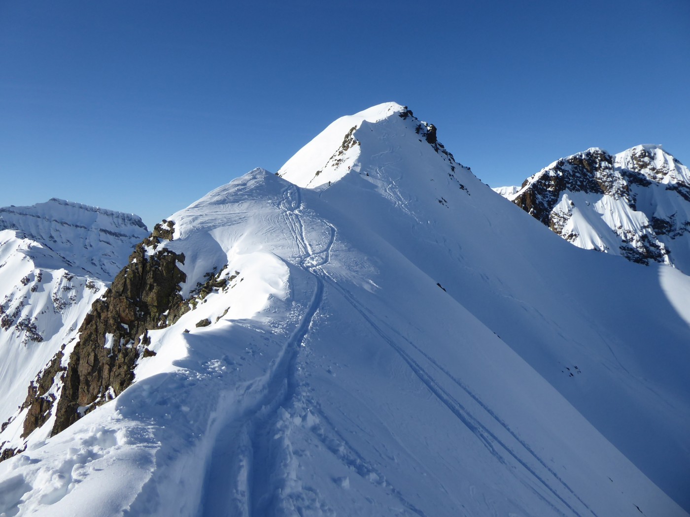 Beaucoup de monde à Bel Oiseau (C11). Le couloir NE (C12) est tracé mais pas la face E (C13.2) ni le couloir ENE (C12.2). Moins de monde côté col de Fenestral. La Comba Rossa et le couloir E de l'épaule sud ont été tracé peu de temps avant nous. Bon enneigement dans la forêt pour monter à l'alpage de Fenestral.