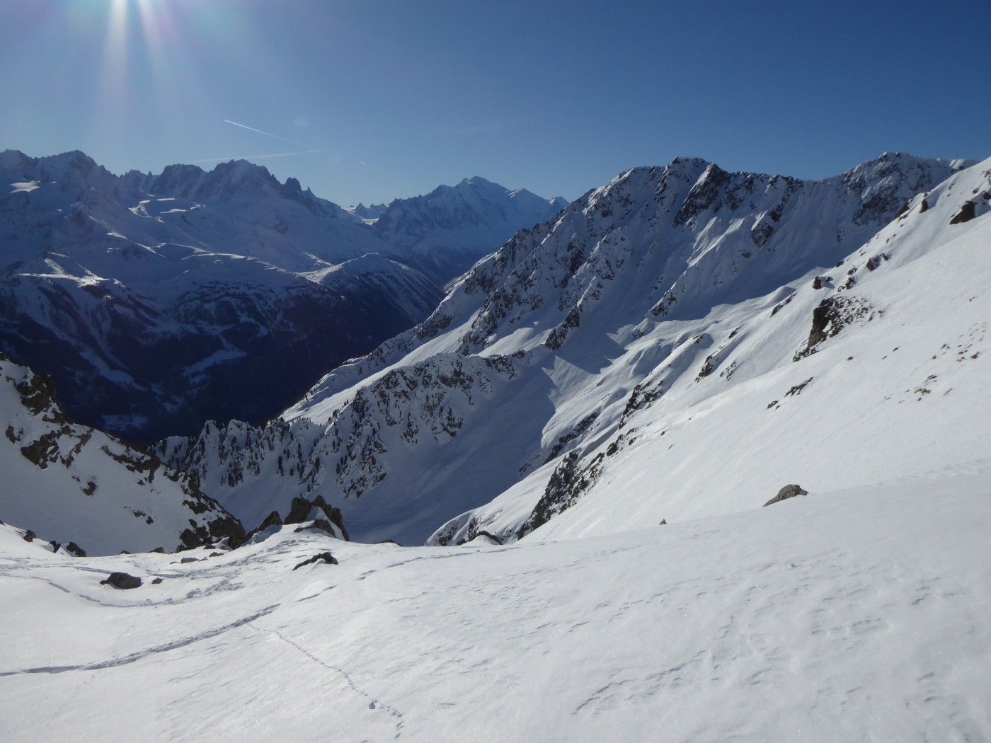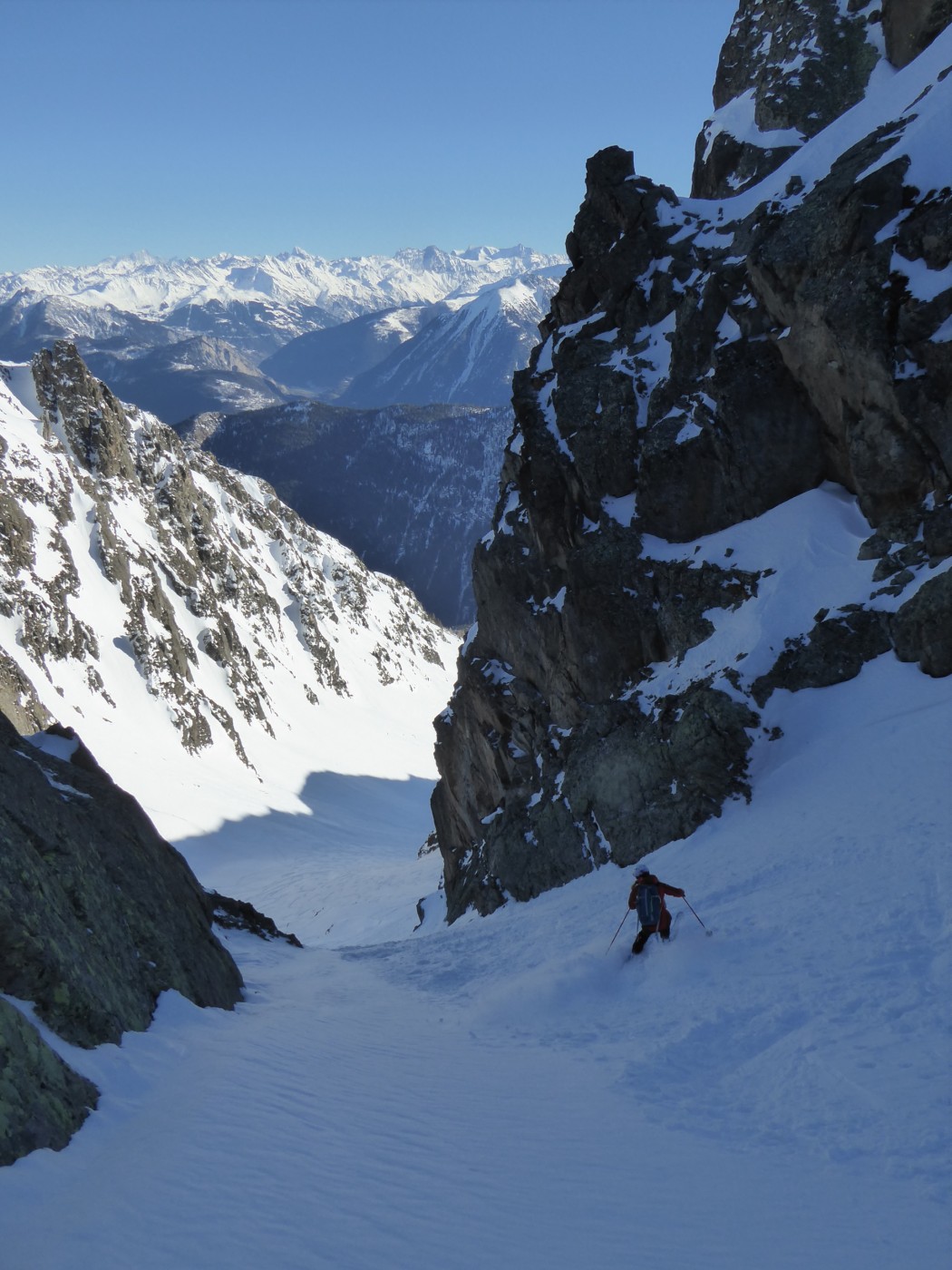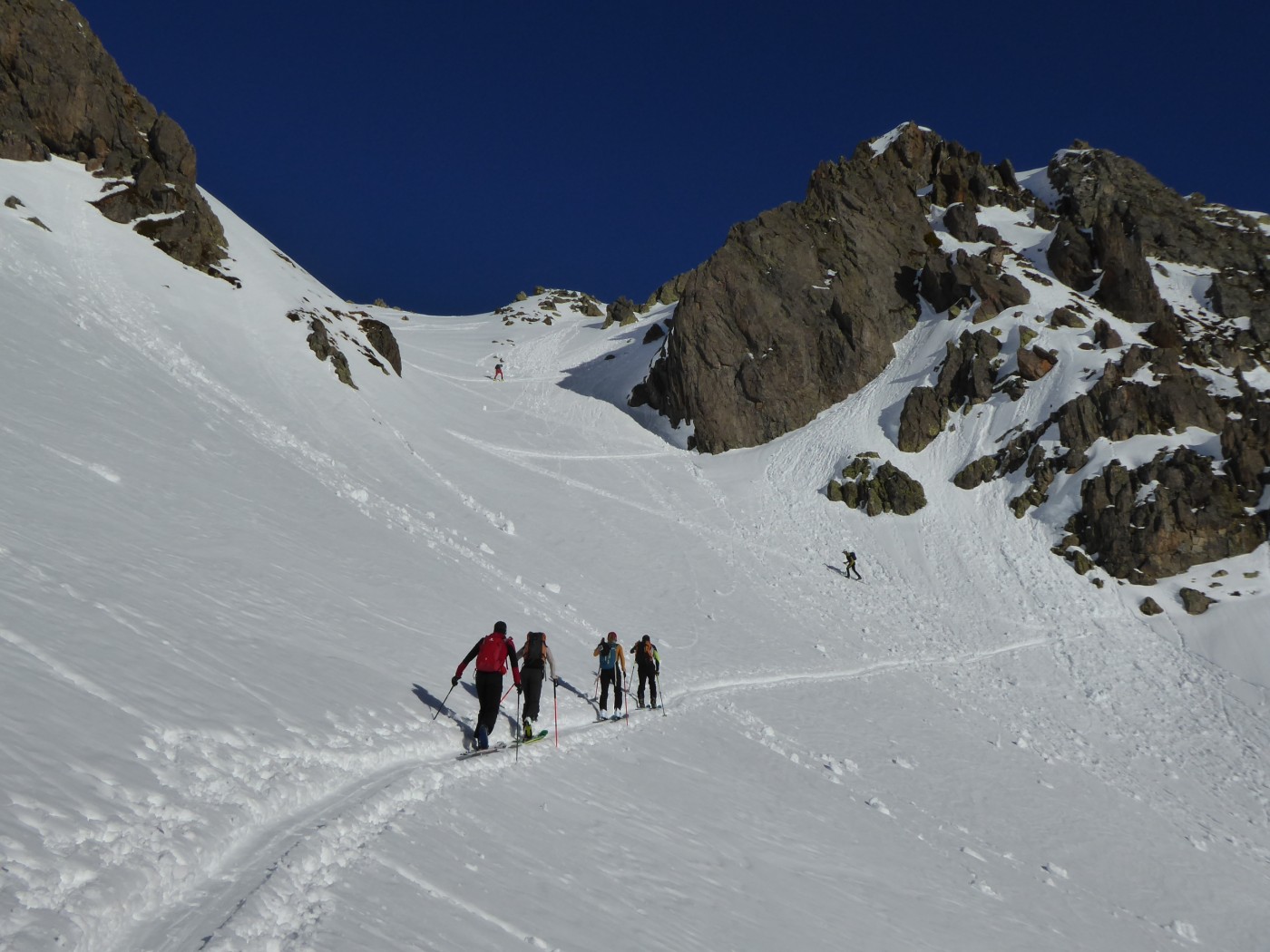 C13 jusqu'au sommet de Blantsin. Descente par C14 jusque 2350 environ puis C15 pour rejoindre la Comba Rossa. Couloir E de l'épaule sud de la dent de Fenestral en AR (15.2).