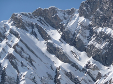 Dans le couloir d' accès à la rampe,le soleil a formé une croûte qui casse à pied et sous laquelle il y a 40cms de poudre froide. Dans la traversée et le long des falaises la neige est transfo.