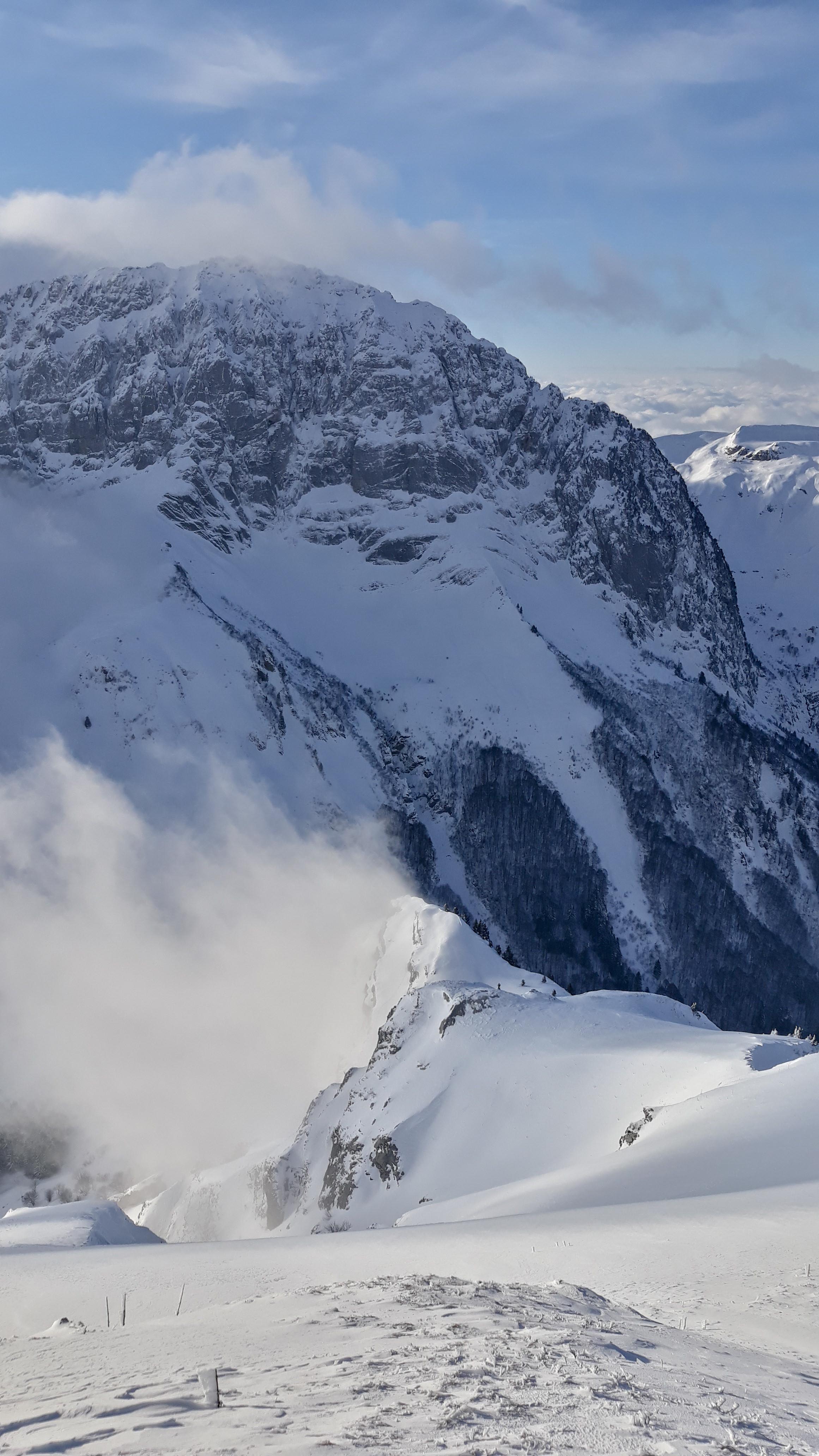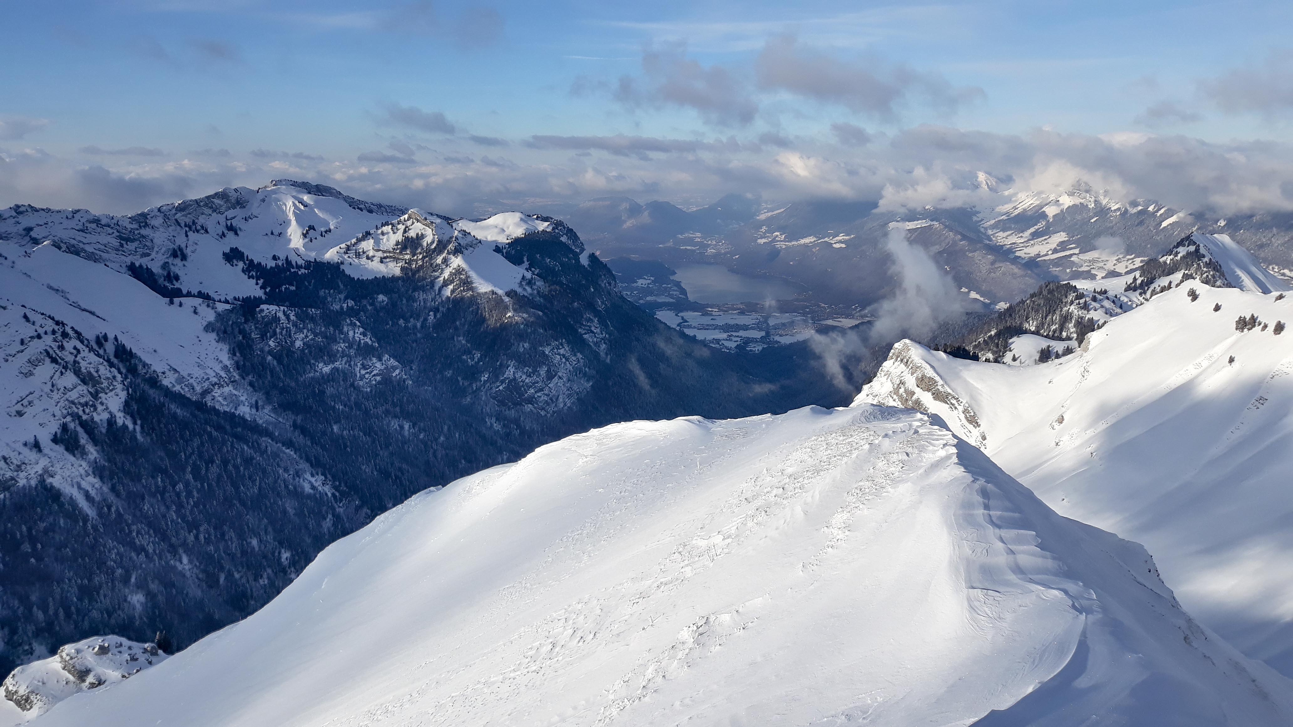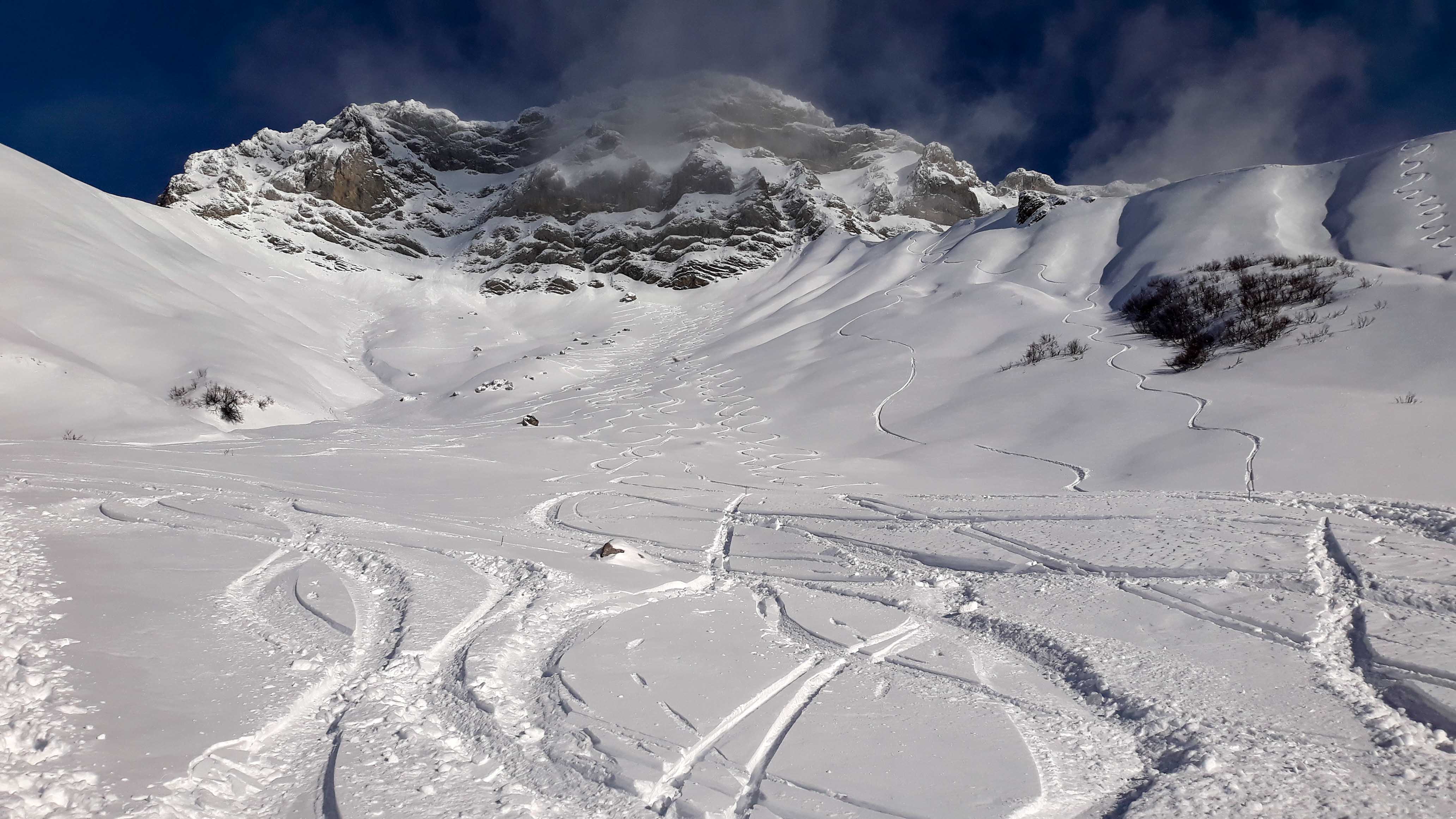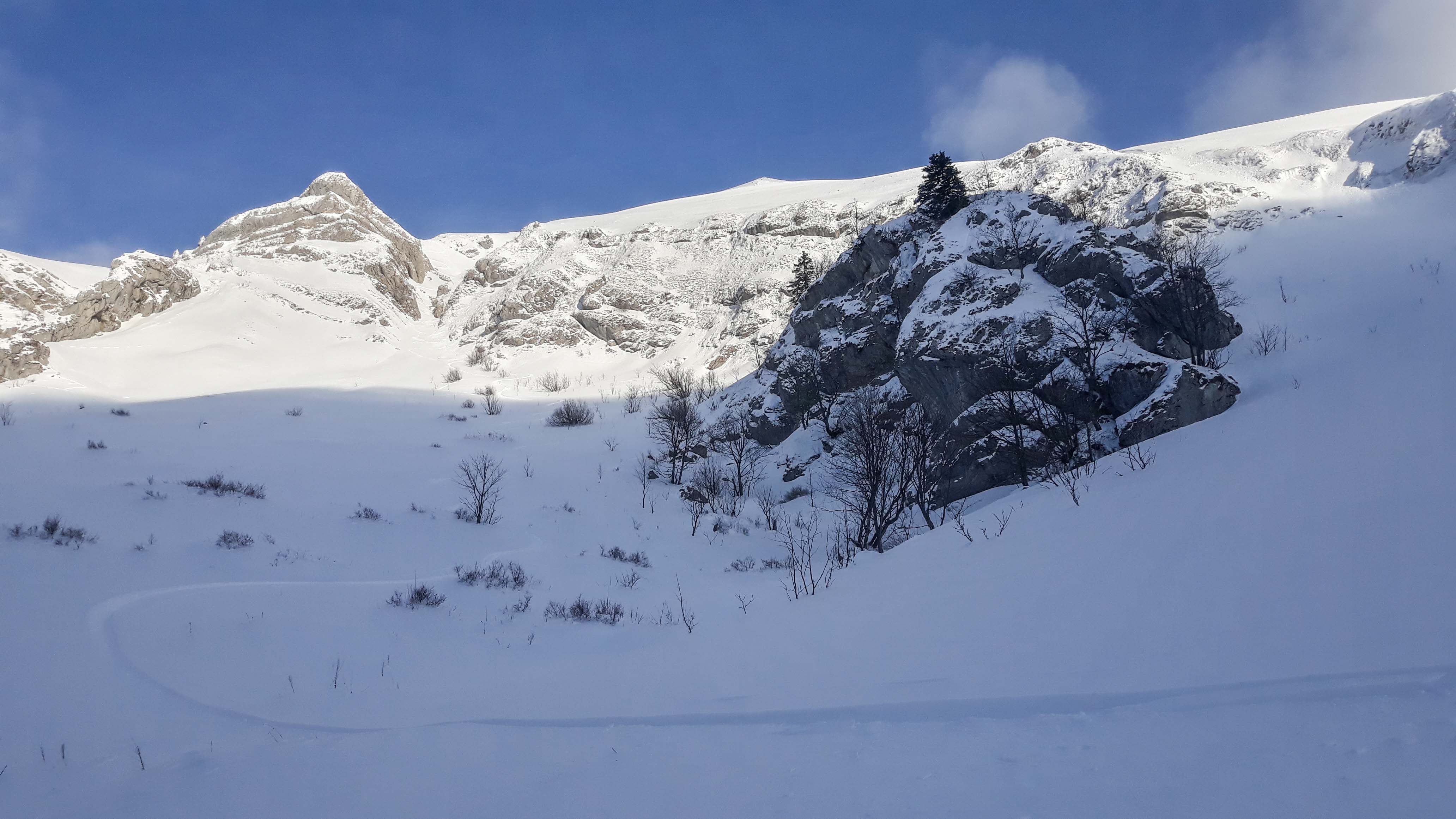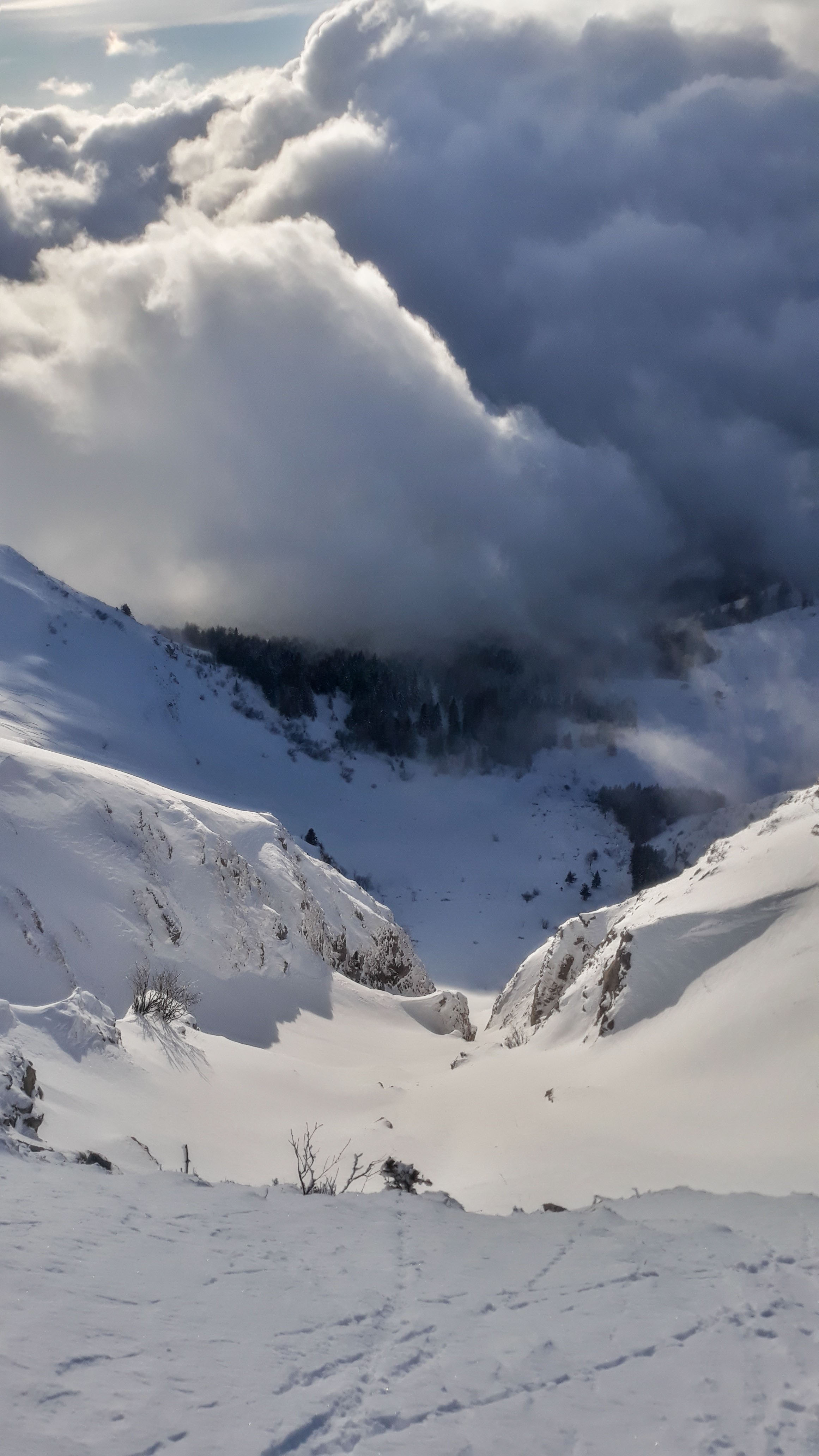 Une dizaine de traces coté Massoly, un peu moins coté du Bonnet, ce qui me décide d'aller basculer du coté du couloir ouest. Après une facette en poudre excellente, j'approche par la droite l'entonnoir qui donne accès à la partie encaissée (joli mais pas dans la meilleure neige), la suite est poudreuse et tip top jusqu'à la voiture