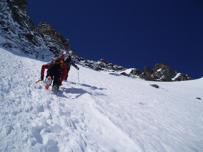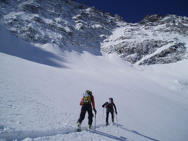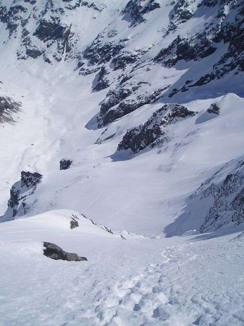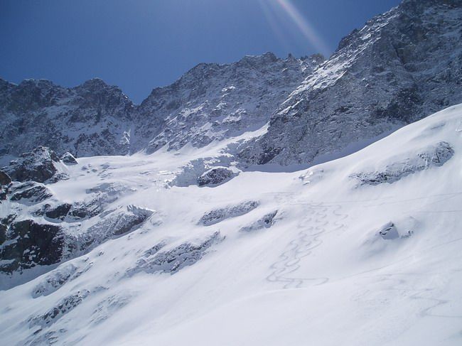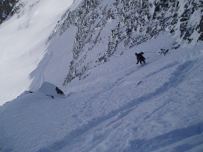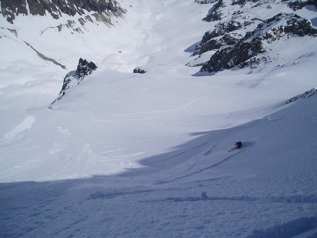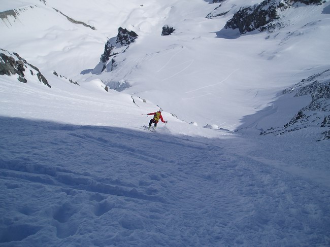 Neige encore poudreuse dès qu'on tourne à gauche pour attaquer le glacier de Tombe Murée. Dans les autres orientations ça chauffe fort. Quelques petites coulées de neige lourde dans les rochers rive gauche du couloir plus ensoleillés.