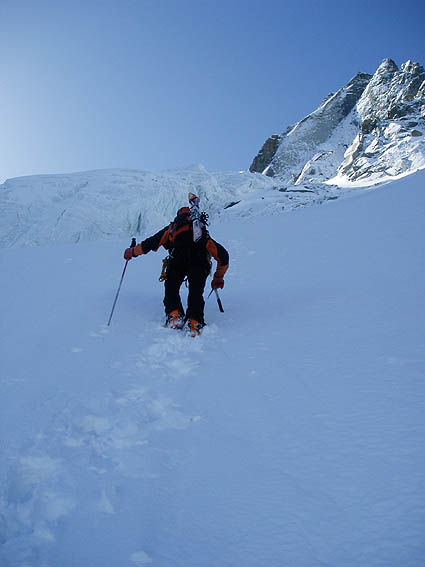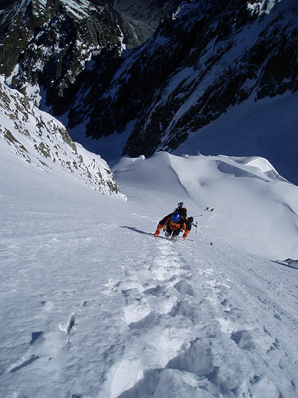 montée et descente rive gauche des Nantillons où l'on est à l'abri des dangers objectifs glaciaires. Pour le couloir, c'est court mais bien raide, 45° dès le bas, 50° au milieu et un peu plus à la sortie de droite. On est dans le style col Claire, i.e. 5.2/E2.