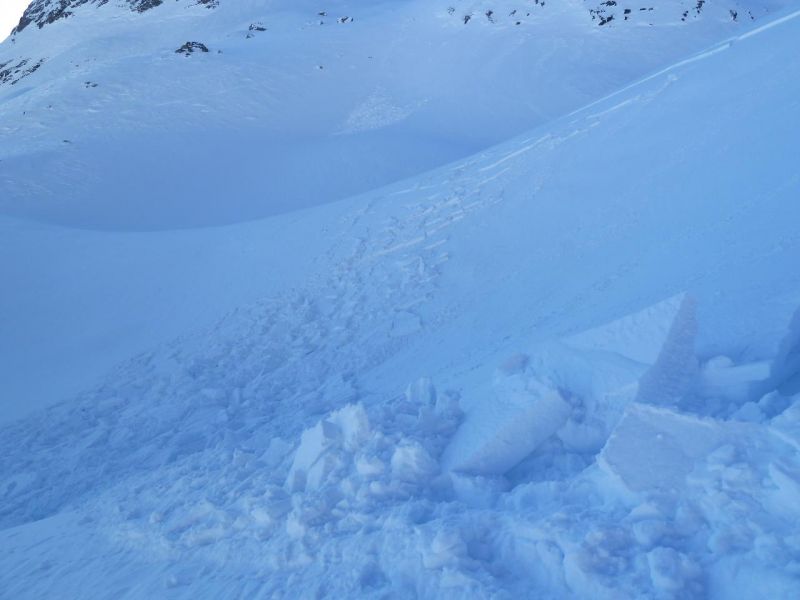 Nous avons déclenché une plaque vers 2300 m en versant est de la Pierra Menta (tout proche du pt 2285) : assez large et cassure jusqu'à 40 cm. Etant juste au-dessus d'un replat, nous avons été "déportés" de quelques mètres. Un peu plus loin, le reste de la plaque est descendue dans un creux en contrebas. C'est parti sous une butte à l'abri du vent de nord.